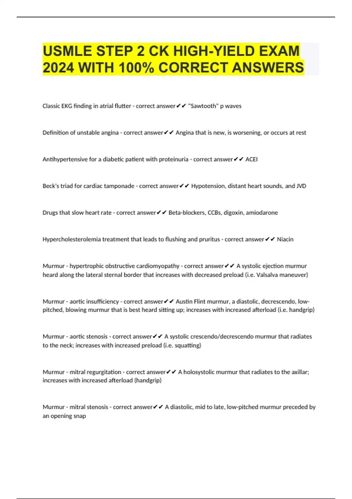 USMLE STEP 2 CK HIGH-YIELD EXAM 2024 WITH 100% CORRECT ANSWERS Classic EKG finding in atrial flutter - correct answer "Sawtooth" p waves Definition of unstable angina - correct answer Angina that is new, is worsening, or occurs at rest Antihypertensive for a diabetic patient with proteinuria - correct answer ACEI Beck's triad for cardiac tamponade - correct answer Hypotension, distant heart sounds, and JVD Drugs that slow heart rate - correct answer Beta-blockers, CCBs, digoxin, amiodarone Hypercholesterolemia treatment that leads to flushing and pruritus - correct answer Niacin Murmur - hypertrophic obstructive cardiomyopathy - correct answer A systolic ejection murmur heard along the lateral sternal border that increases with decreased preload (i.e. Valsalva maneuver) Murmur - aortic insufficiency - correct answer Austin Flint murmur, a diastolic, decrescendo, low-pitche