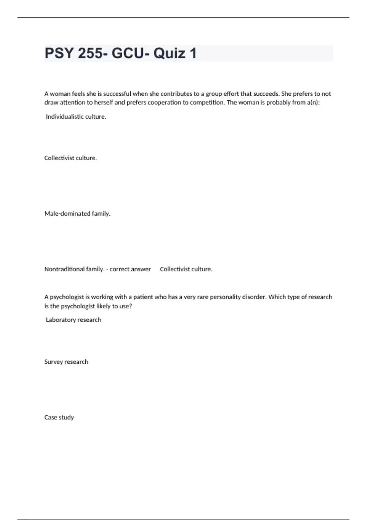 PSY 255- GCU- Quiz 1 Test Exam With Verified Correct Complete Solution| 2024.