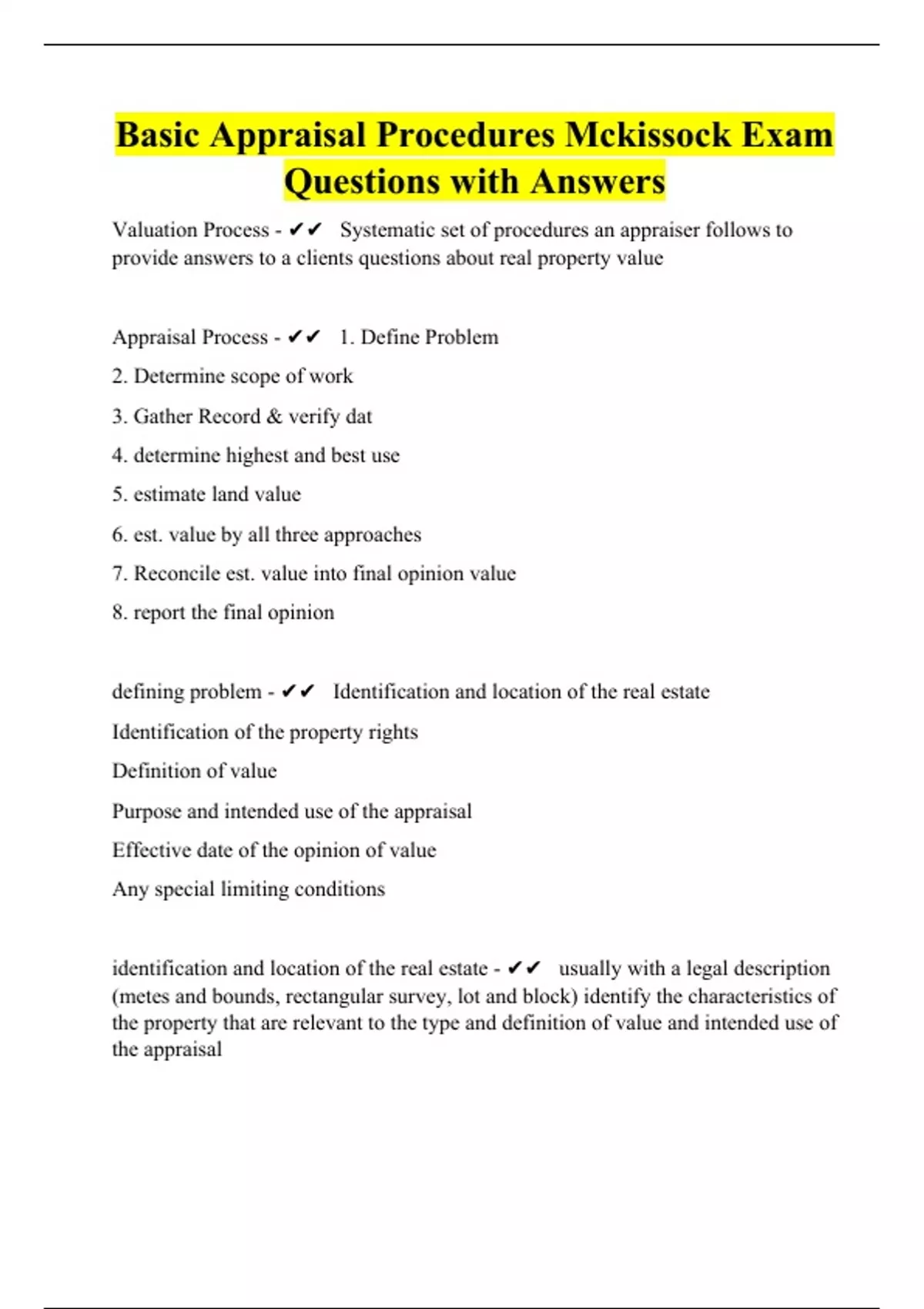 Basic Appraisal Procedures Mckissock Exam Questions with Answers