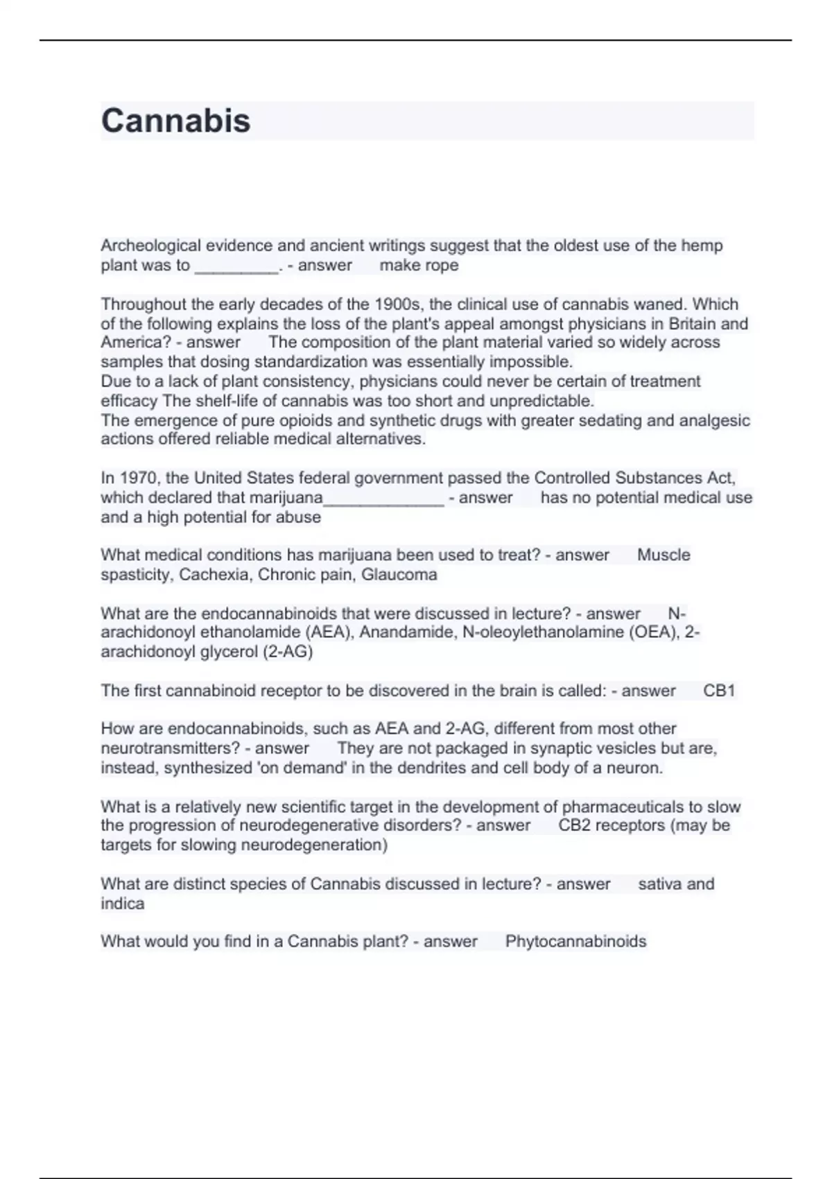 Cannabis Questions and Answers 100% Solved