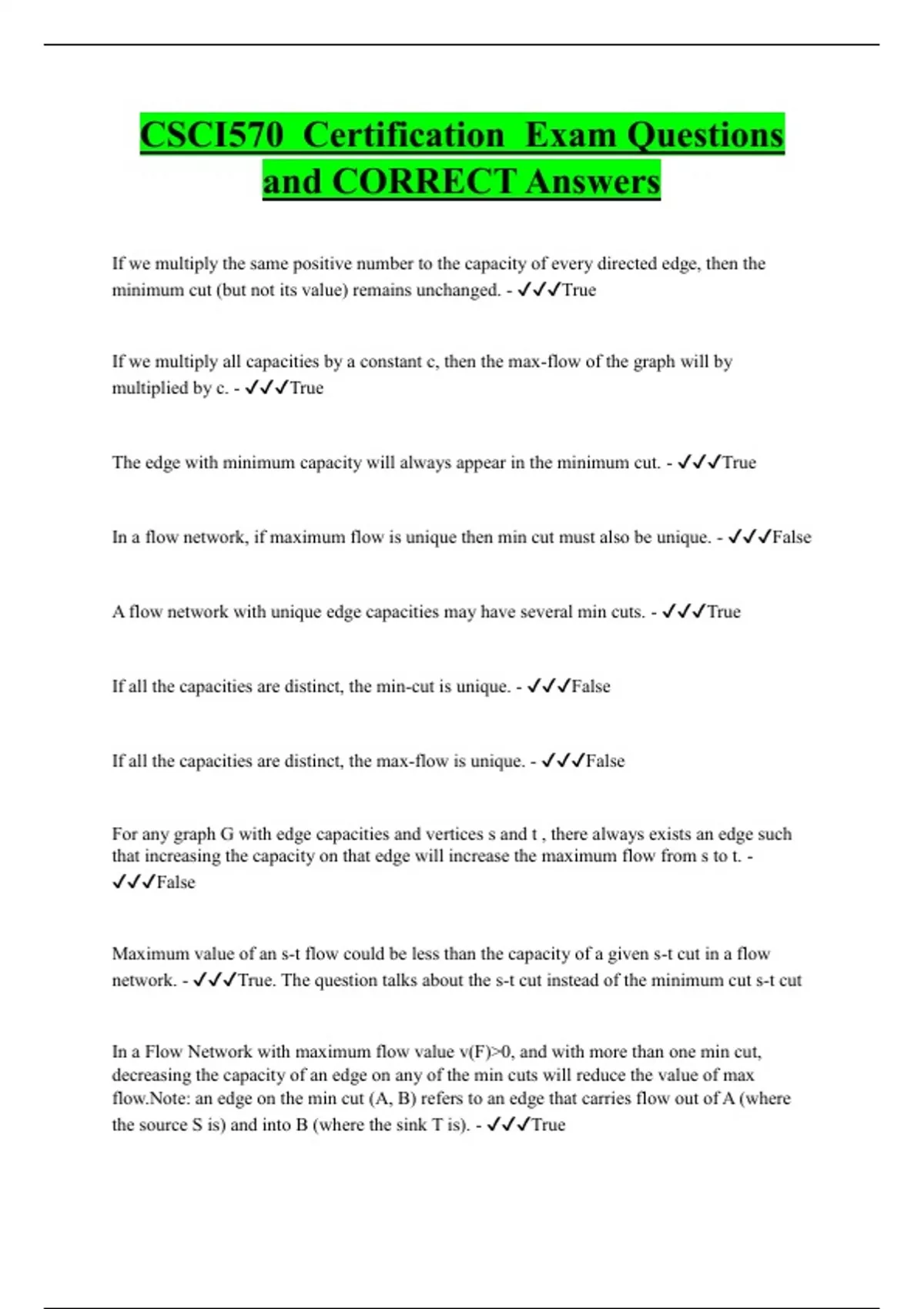 If we multiply the same positive number to the capacity of every directed edge, then the minimum cut (but not its value) remains unchanged. - True If we multiply all capacities by a constant c, then the max-flow of the graph will by multiplied by c. - True The edge with minimum capacity will always appear in the minimum cut. - True In a flow network, if maximum flow is unique then min cut must also be unique. - False A flow network with unique edge capacities may have several min cuts. - True If all the capacities are distinct, the min-cut is unique. - False
