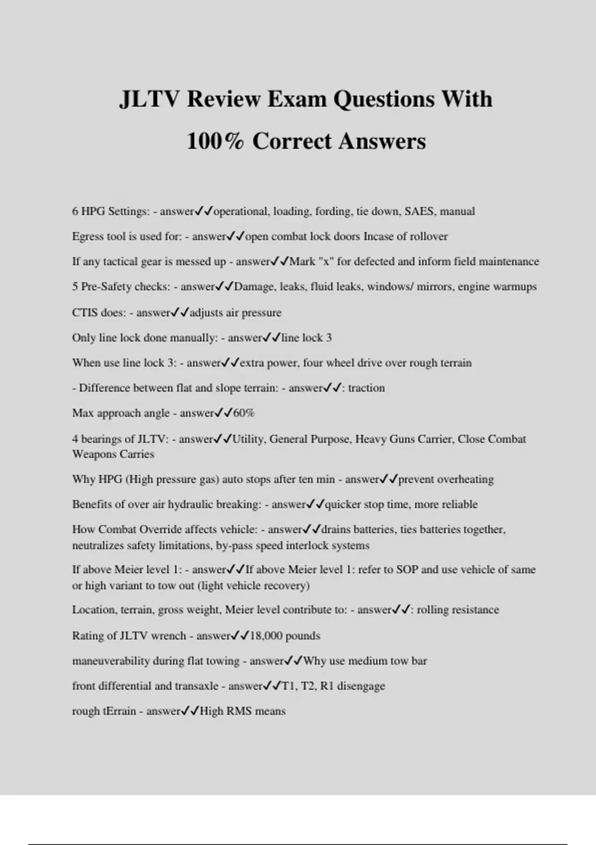 JLTV Review Exam Questions With 100% Correct Answers 6 HPG Settings: - answeroperational, loading, fording, tie down, SAES, manual Egress tool is used for: - answeropen combat lock doors Incase of rollover If any tactical gear is messed up - answerMark "x" for defected and inform field maintenance 5 Pre-Safety checks: - answerDamage, leaks, fluid leaks, windows/ mirrors, engine warmups CTIS does: - answeradjusts air pressure Only line lock done manually: - answerline lock 3 When use line lock 3: - answerextra power, four wheel drive over rough terrain - Difference between flat and slope terrain: - answer: traction Max approach angle - answer60% 4 bearings of JLTV: - answerUtility, General Purpose, Heavy Guns Carrier, Close Combat Weapons Carries Why HPG (High pressure gas) auto stops after ten min - answerprevent overheating Benefits of over air hydraulic breaking: - answerquicker stop time, more reliable How Combat Override affects vehicle: - answerdrains batteries, ties batteries together, neutralizes safety limitations, by-pass speed interlock systems If above Meier level 1: - answerIf above Meier level 1: refer to SOP and use vehicle of same or high variant to tow out (light vehicle recovery) Location, terrain, gross weight, Meier level contribute to: - answer: rolling resistance Rating of JLTV wrench - answer18,000 pounds maneuverability during flat towing - answerWhy use medium tow bar front differential and transaxle - answerT1, T2, R1 disengage rough tErrain - answerHigh RMS means
