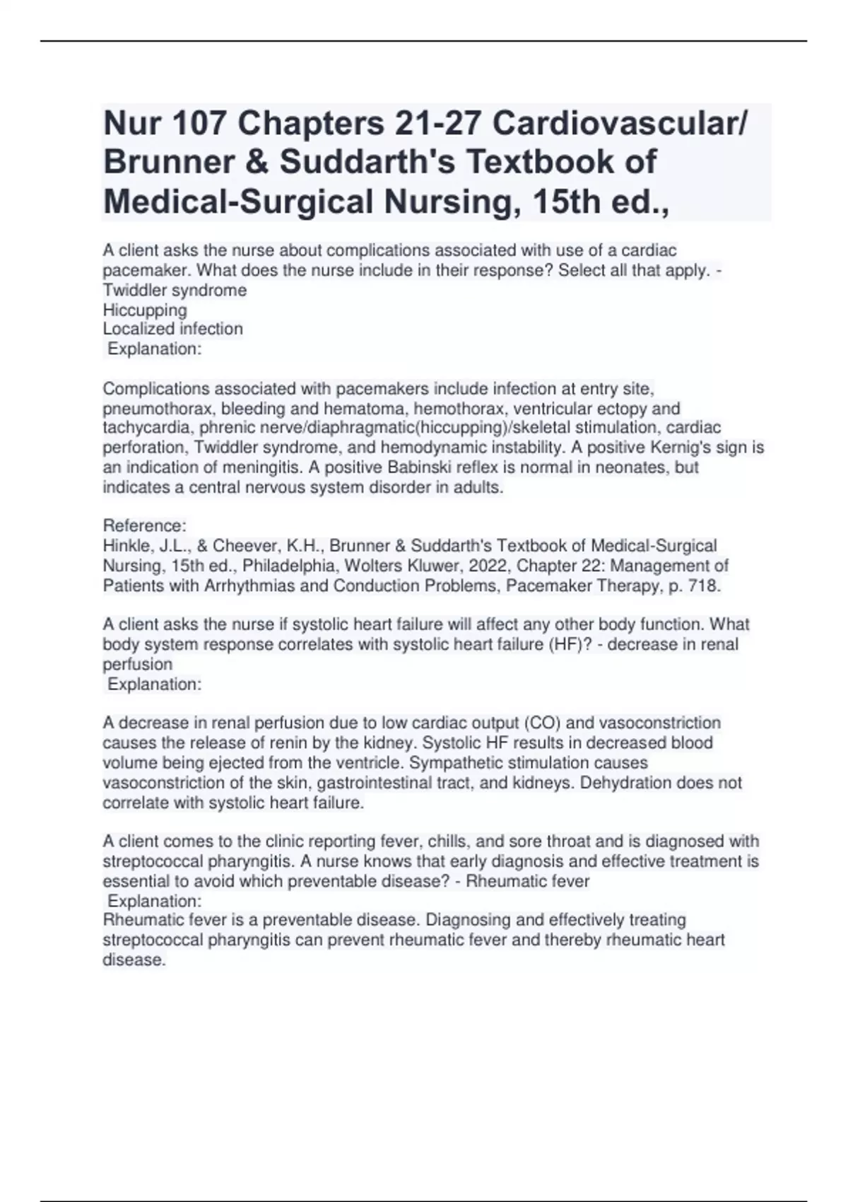 A client asks the nurse about complications associated with use of a cardiac pacemaker. What does the nurse include in their response? Select all that apply. - Twiddler syndrome Hiccupping Localized infection Explanation: Complications associated with pacemakers include infection at entry site, pneumothorax, bleeding and hematoma, hemothorax, ventricular ectopy and tachycardia, phrenic nerve/diaphragmatic(hiccupping)/skeletal stimulation, cardiac perforation, Twiddler syndrome, and hemodynamic instability. A positive Kernig's sign is an indication of meningitis. A positive Babinski reflex is normal in neonates, but indicates a central nervous system disorder in adults. Reference: Hinkle, J.L., & Cheever, K.H., Brunner & Suddarth's Textbook of Medical-Surgical Nursing, 15th ed., Philadelphia, Wolters Kluwer, 2022, Chapter 22: Management of Patients with Arrhythmias and Conduction Problems, Pacemaker Therapy, p. 718. A client asks the nurse if systolic heart failure will affect any other body function. What body system response correlates with systolic heart failure (HF)? - decrease in renal perfusion Explanation: A decrease in renal perfusion due to low cardiac output (CO) and vasoconstriction causes the release of renin by the kidney. Systolic HF results in decreased blood volume being ejected from the ventricle. Sympathetic stimulation causes vasoconstriction of the skin, gastrointestinal tract, and kidneys. Dehydration does not correlate with systolic heart failure. A client comes to the clinic reporting fever, chills, and sore throat and is diagnosed with streptococcal pharyngitis. A nurse knows that early diagnosis and effective treatment is essential to avoid which preventable disease? - Rheumatic fever Explanation: Rheumatic fever is a preventable disease. Diagnosing and effectively treating streptococcal pharyngitis can prevent rheumatic fever and thereby rheumatic heart disease.