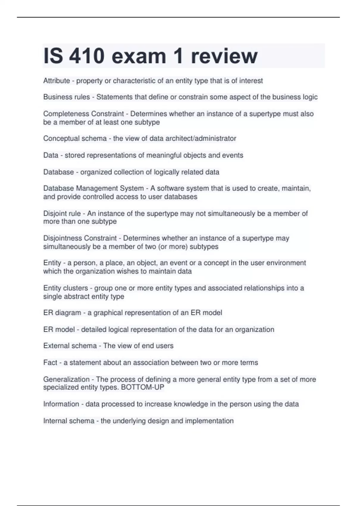 Attribute - property or characteristic of an entity type that is of interest Business rules - Statements that define or constrain some aspect of the business logic Completeness Constraint - Determines whether an instance of a supertype must also be a member of at least one subtype Conceptual schema - the view of data architect/administrator Data - stored representations of meaningful objects and events Database - organized collection of logically related data Database Management System - A software system that is used to create, maintain, and provide controlled access to user databases Disjoint rule - An instance of the supertype may not simultaneously be a member of more than one subtype Disjointness Constraint - Determines whether an instance of a supertype may simultaneously be a member of two (or more) subtypes Entity - a person, a place, an object, an event or a concept in the user environment which the organization wishes to maintain data Entity clusters - group one or more entity types and associated relationships into a single abstract entity type ER diagram - a graphical representation of an ER model ER model - detailed logical representation of the data for an organization External schema - The view of end users Fact - a statement about an association between two or more terms Generalization - The process of defining a more general entity type from a set of more specialized entity types. BOTTOM-UP Information - data processed to increase knowledge in the person using the data Internal schema - the underlying design and implementation