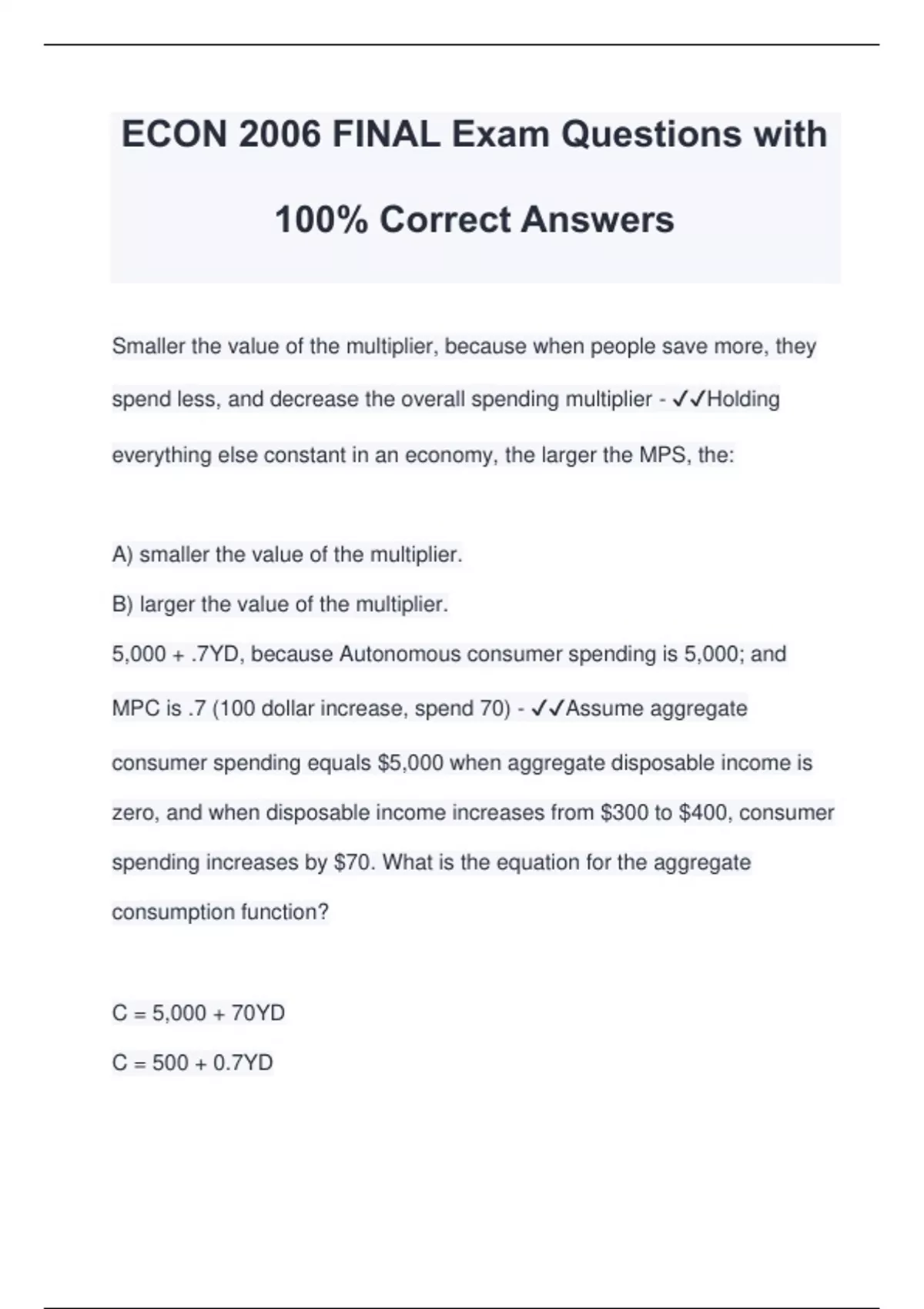 ECON 2006 FINAL Exam Questions with 100% Correct Answers Smaller the value of the multiplier, because when people save more, they spend less, and decrease the overall spending multiplier - Holding everything else constant in an economy, the larger the MPS, the: A) smaller the value of the multiplier. B) larger the value of the multiplier. 5,000 + .7YD, because Autonomous consumer spending is 5,000; and MPC is .7 (100 dollar increase, spend 70) - Assume aggregate consumer spending equals $5,000 when aggregate disposable income is zero, and when disposable income increases from $300 to $400, consumer spending increases by $70. What is the equation for the aggregate consumption function? C = 5,000 + 70YD C = 500 + 0.7YD