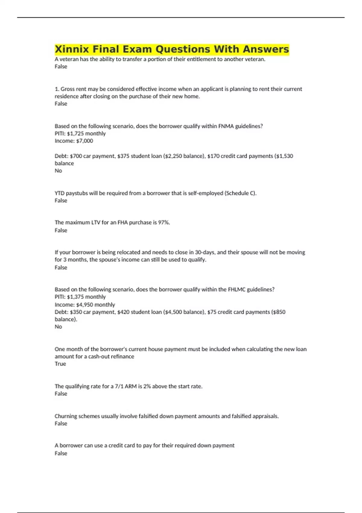 Xinnix Final Exam Questions With Answers A veteran has the ability to transfer a portion of their entitlement to another veteran. False 1. Gross rent may be considered effective income when an applicant is planning to rent their current residence after closing on the purchase of their new home. False Based on the following scenario, does the borrower qualify within FNMA guidelines? PITI: $1,725 monthly Income: $7,000 Debt: $700 car payment, $375 student loan ($2,250 balance), $170 credit card payments ($1,530 balance No YTD paystubs will be required from a borrower that is self-employed (Schedule C). False The maximum LTV for an FHA purchase is 97%. False If your borrower is being relocated and needs to close in 30-days, and their spouse will not be moving for 3 months, the spouse's income can still be used to qualify. False Based on the following scenario, does the borrower qualify within the FHLMC guidelines? PITI: $1,375 monthly Income: $4,950 monthly Debt: $350 car payment, $420 student loan ($4,500 balance), $75 credit card payments ($850 balance). No One month of the borrower's current house payment must be included when calculating the new loan amount for a cash-out refinance True The qualifying rate for a 7/1 ARM is 2% above the start rate. False Churning schemes usually involve falsified down payment amounts and falsified appraisals. False A borrower can use a credit card to pay for their required down payment False