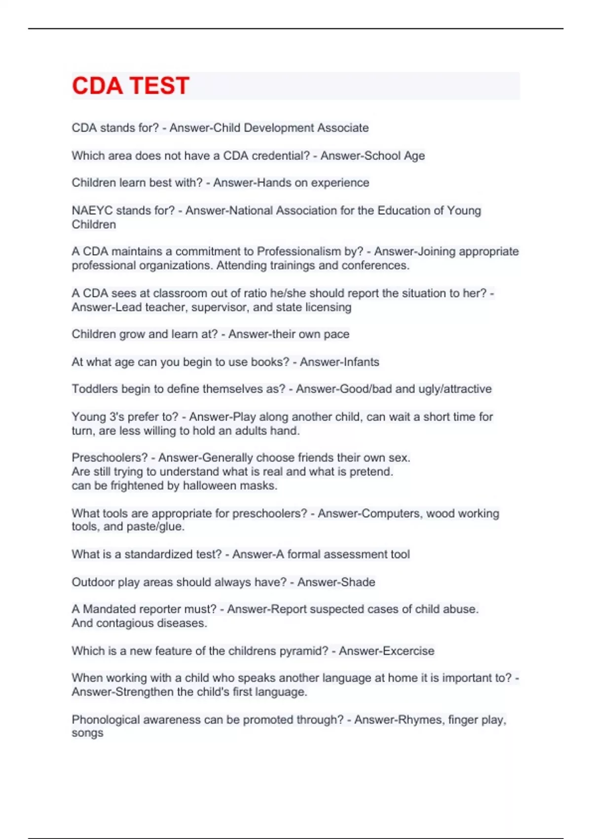 CDA TEST CDA stands for? - Answer-Child Development Associate Which area does not have a CDA credential? - Answer-School Age Children learn best with? - Answer-Hands on experience NAEYC stands for? - Answer-National Association for the Education of Young Children A CDA maintains a commitment to Professionalism by? - Answer-Joining appropriate professional organizations. Attending trainings and conferences. A CDA sees at classroom out of ratio he/she should report the situation to her? - Answer-Lead teacher, supervisor, and state licensing Children grow and learn at? - Answer-their own pace At what age can you begin to use books? - Answer-Infants Toddlers begin to define themselves as? - Answer-Good/bad and ugly/attractive Young 3's prefer to? - Answer-Play along another child, can wait a short time for turn, are less willing to hold an adults hand. Preschoolers? - Answer-Generally choose friends their own sex. Are still trying to understand what is real and what is pretend. can be frightened by halloween masks. What tools are appropriate for preschoolers? - Answer-Computers, wood working tools, and paste/glue. What is a standardized test? - Answer-A formal assessment tool Outdoor play areas should always have? - Answer-Shade A Mandated reporter must? - Answer-Report suspected cases of child abuse. And contagious diseases. Which is a new feature of the childrens pyramid? - Answer-Excercise When working with a child who speaks another language at home it is important to? - Answer-Strengthen the child's first language. Phonological awareness can be promoted through? - Answer-Rhymes, finger play, songs Children are ready to read on their own when? - Answer-They can sit u
