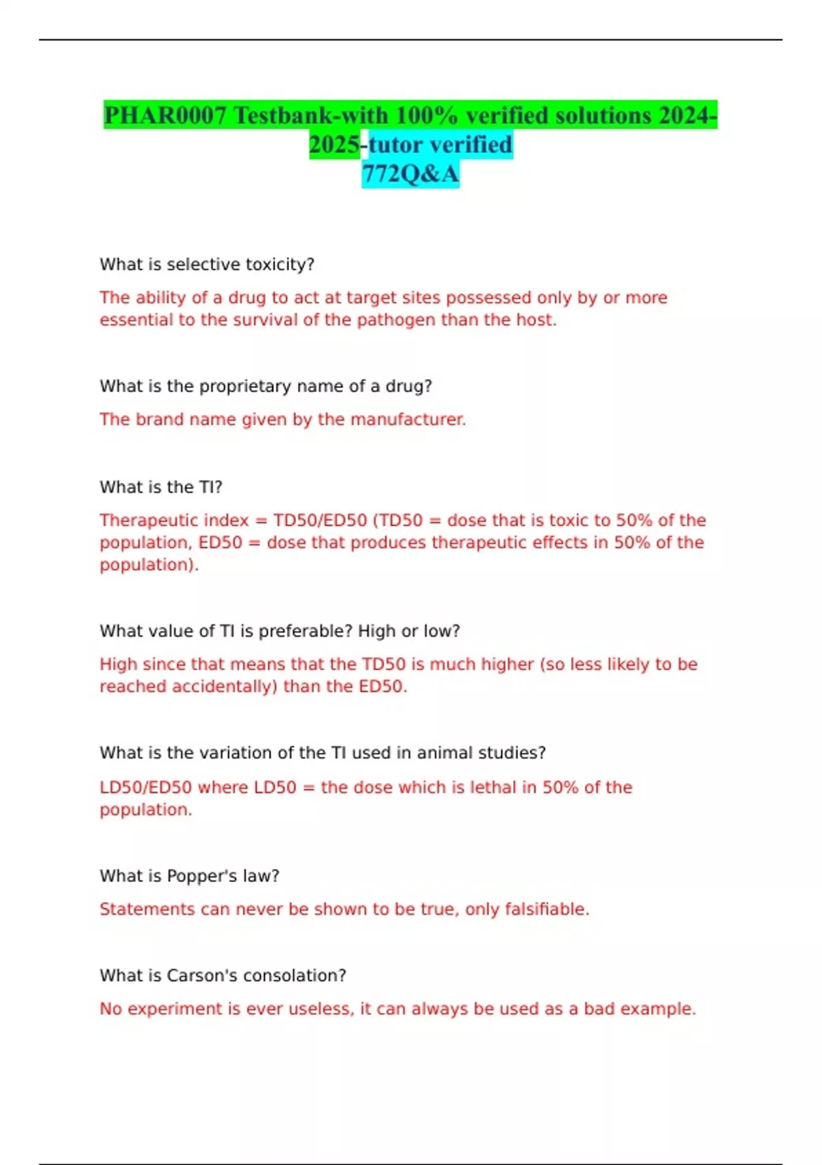 PHAR0007 Testbank-with 100% verified solutions -tutor verified