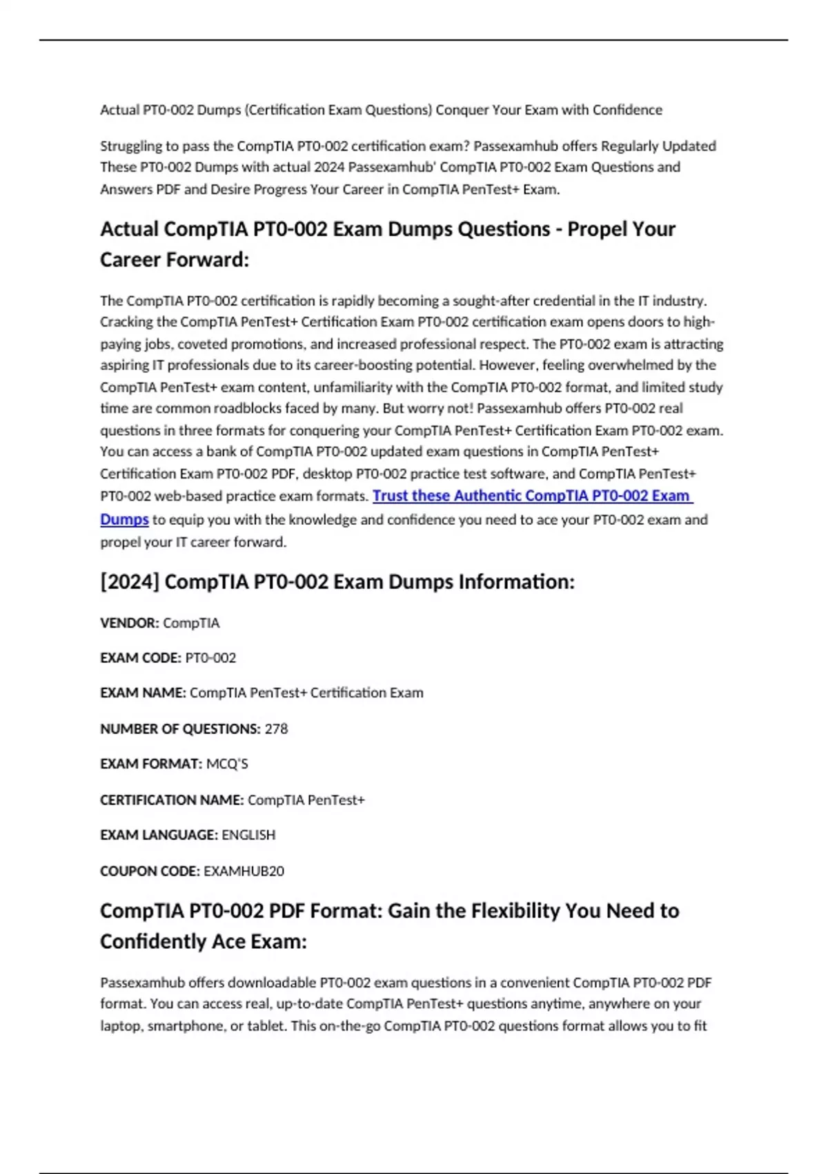 Struggling to pass the CompTIA PT0–002 certification exam? Passexamhub offers Regularly Updated These PT0–002 Dumps with actual 2024 Passexamhub’ CompTIA PT0–002 Exam Questions and Answers PDF and Desire Progress Your Career in CompTIA PenTest+ Exam.