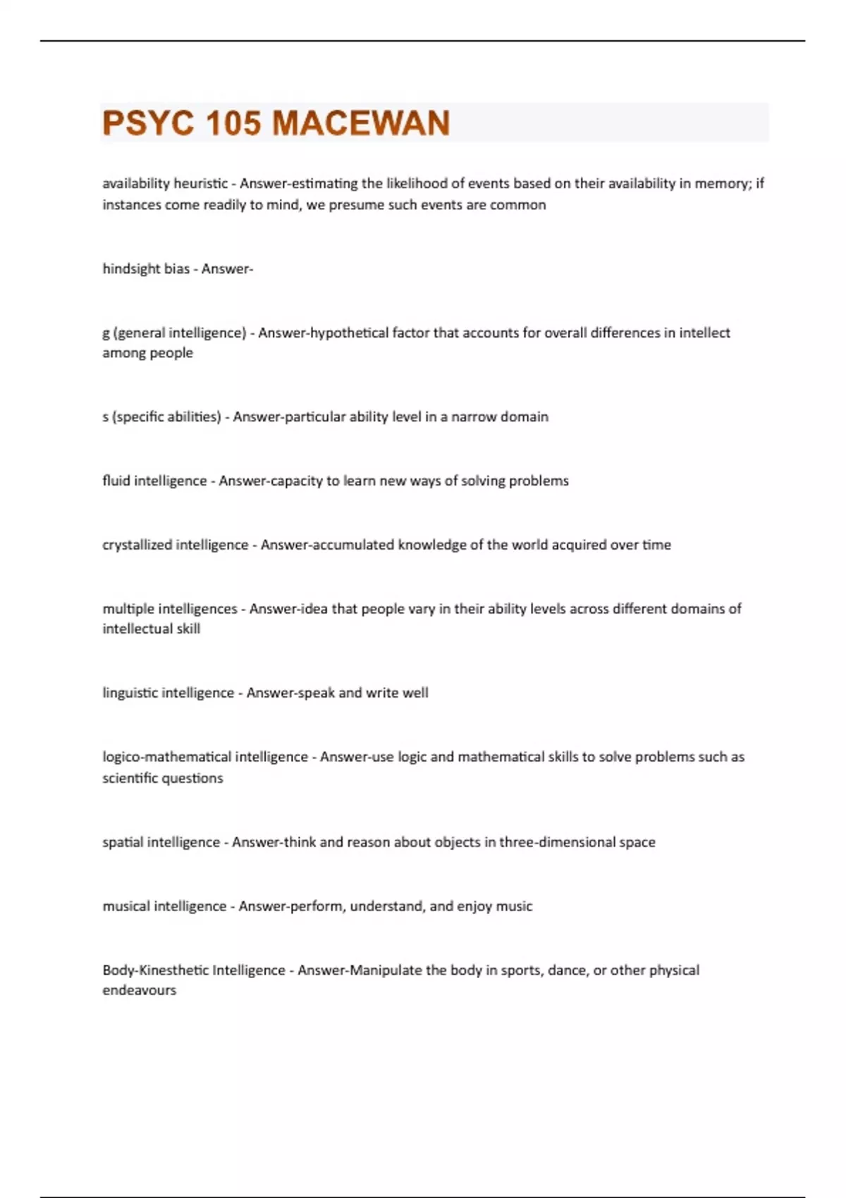 availability heuristic - Answer-estimating the likelihood of events based on their availability in memory; if instances come readily to mind, we presume such events are common hindsight bias - Answerg (general intelligence) - Answer-hypothetical factor that accounts for overall differences in intellect among people s (specific abilities) - Answer-particular ability level in a narrow domain fluid intelligence - Answer-capacity to learn new ways of solving problems crystallized intelligence - Answer-accumulated knowledge of the world acquired over time multiple intelligences - Answer-idea that people vary in their ability levels across different domains of intellectual skill linguistic intelligence - Answer-speak and write well logico-mathematical intelligence - Answer-use logic and mathematical skills to solve problems such as scientific questions spatial intelligence - Answer-think and reason about objects in three-dimensional space musical intelligence - Answer-perform, understand, and enjoy music Body-Kinesthetic Intelligence - Answer-Manipulate the body in sports, dance, or other physical endeavoursinterpersonal intelligence - Answer-understand and interact effectively with others interpersonal intelligence - Answer-Understand and possess insight into self Naturalistic intelligence - Answer-Recognize, identify, and understand animals, plants, and other living things Analytical Intelligence (Sternberg) - Answer-Book smarts Practical Intelligence (Sternberg) - Answer-street smarts and common sense Creative Intelligence (Sternberg) - Answer-Creativity Stanford-Binet Test - Answer-intelligence test based on the measure developed by Binet and Simon, adapted by Lewis Terman of Stanford University intelligence quotient (IQ) - Answer-systematic means of quantifying differences among people in their intelligence mental age - Answer-age corresponding to the average individual's performance on an intelligence test Deviation IQ - Answer-expression of a person's IQ relative to his or her same-aged peers Eugenics - Answer-movement in the early 20th century to improve a population's genetic stock by encouraging those with good genes to reproduce, preventing those with bad genes from reproducing, or both Wecshler Adult Intelligence Scale (WAIS) - Answer-most widely used intelligence test; contains verbal and performance subtestsCulture-fair IQ test - Answer-abstract reasoning measure that doesn't depend on language and is often believed to be less influenced by cultural factors than other IQ tests are intellectual disability - Answerdevelopmental psychology - Answer-study of how behavior changes over the lifespan cross-sectional design - Answer-research design that examines people of different ages at a single point in time cohort effect - Answer-effect observed in a sample of participants that results from individuals in the sample growing up at the same time Nature via nurture - Answer-tendency of individuals with certain genetic predispositions to seek out and create environments that permit the expression of those predispositions