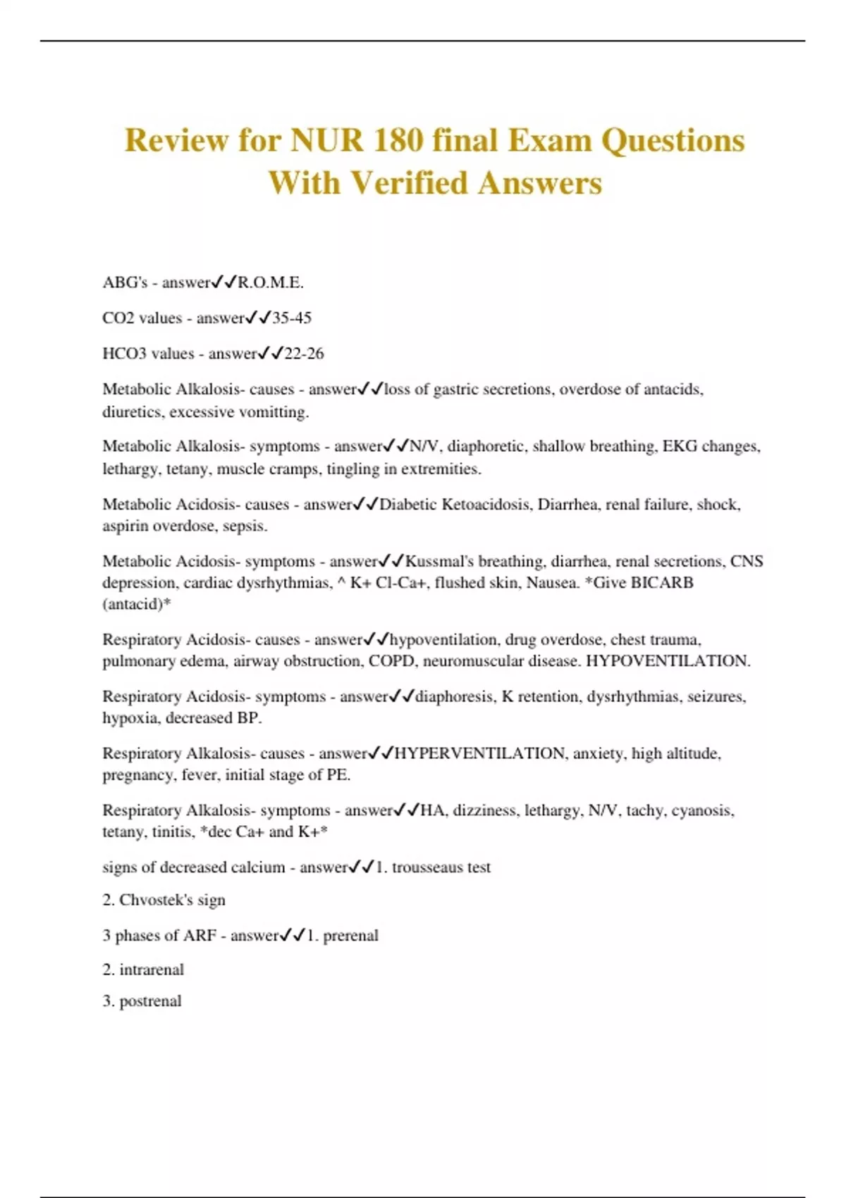 Review for NUR 180 final Exam Questions With Verified Answers ABG's - answerR.O.M.E. CO2 values - answer35-45 HCO3 values - answer22-26 Metabolic Alkalosis- causes - answerloss of gastric secretions, overdose of antacids, diuretics, excessive vomitting. Metabolic Alkalosis- symptoms - answerN/V, diaphoretic, shallow breathing, EKG changes, lethargy, tetany, muscle cramps, tingling in extremities. Metabolic Acidosis- causes - answerDiabetic Ketoacidosis, Diarrhea, renal failure, shock, aspirin overdose, sepsis. Metabolic Acidosis- symptoms - answerKussmal's breathing, diarrhea, renal secretions, CNS depression, cardiac dysrhythmias, ^ K+ Cl-Ca+, flushed skin, Nausea. *Give BICARB (antacid)* Respiratory Acidosis- causes - answerhypoventilation, drug overdose, chest trauma, pulmonary edema, airway obstruction, COPD, neuromuscular disease. HYPOVENTILATION. Respiratory Acidosis- symptoms - answerdiaphoresis, K retention, dysrhythmias, seizures, hypoxia, decreased BP. Respiratory Alkalosis- causes - answerHYPERVENTILATION, anxiety, high altitude, pregnancy, fever, initial stage of PE. Respiratory Alkalosis- symptoms - answerHA, dizziness, lethargy, N/V, tachy, cyanosis, tetany, tinitis, *dec Ca+ and K+* signs of decreased calcium - answer1. trousseaus test 2. Chvostek's sign 3 phases of ARF - answer1. prerenal 2. intrarenal 3. postrenal post-op nursing care for lithotripsy - answerfrequent VS, watch for copmplications, bleeding- bright red urine, placement and patency of catheter ARF diagnostic tests - answerRenal US, CT scan, IV pyelography, renal biopsy Lithotripsy - answerESWL,sound, laser to dry shock waves to break up stone. open surgical procedures for Kidney stones - answer1. open ureterolithotomy - into ureter 2. pyelolithotomy - into kidney pelvis 3. nephrolithotomy - into kidney calcium stone med - answerthiazide diuretics *avoid dairy* Corticosteroids - answerfluticasone, prednison. potassium lab values - answer3.5-5.0 COPD rescue drugs - answerBETA AGONISTS. bronchodilation, improved hyperinflation, dyspnea. Most dramatic SX of ARF in younger adults - answermarked oliguria Anticholinergic Agents - answerATROVENT, APOLPRAVENT, SPIRIVA. bronchodilation. long-acting beta agonist - answerSALMETEROL. slow onset w/ long duration. maintenance drug. NOT for attacks. Short-acting beta agonists - answerALBUTEROL, BITOLTEROL, LEVABUTEROL, PIRBUTEROL, TERBUTALINE. used before or DURING asthma attack. Flucticasone ( FLOVENT) - answerBID, prevents asthma triggered by inflammation or allergies. NSAIDs - answernedocromil, cromolyn sodium. Signs and symptoms of PC - answerAsymptomatic early on, BPH/obstruction symptoms, hematuria, malaise/fatigue, weight loss, pain w/ ejaculation. Low back pain w/ Mets. hypocalcemia symptoms - answerconvulsions, arrhythias, tetany, spasms, stridor. Trousseaus, Chvosteks. NEVER IM! kayexalate - answerused for hyperkalemia, gets rid of excess potassium in blood. Acute Renal Failure - answersudden onset, typically reversible, decreased blood flow, decreased blood volume, or damage to kidneys nephrons.