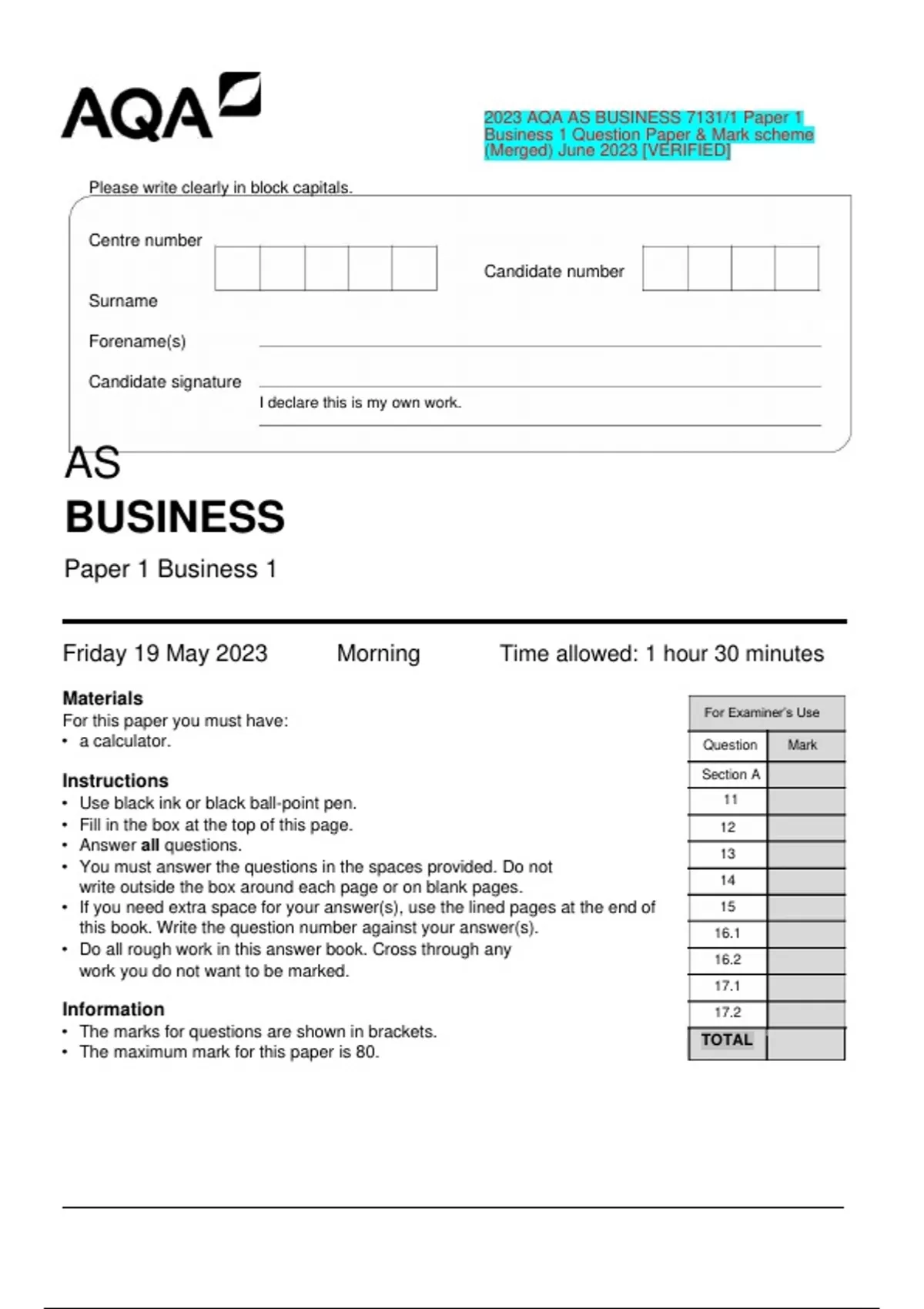2023 AQA AS BUSINESS 7131/1 Paper 1 Business 1 Question Paper & Mark scheme (Merged) June 2023 [VERIFIED]