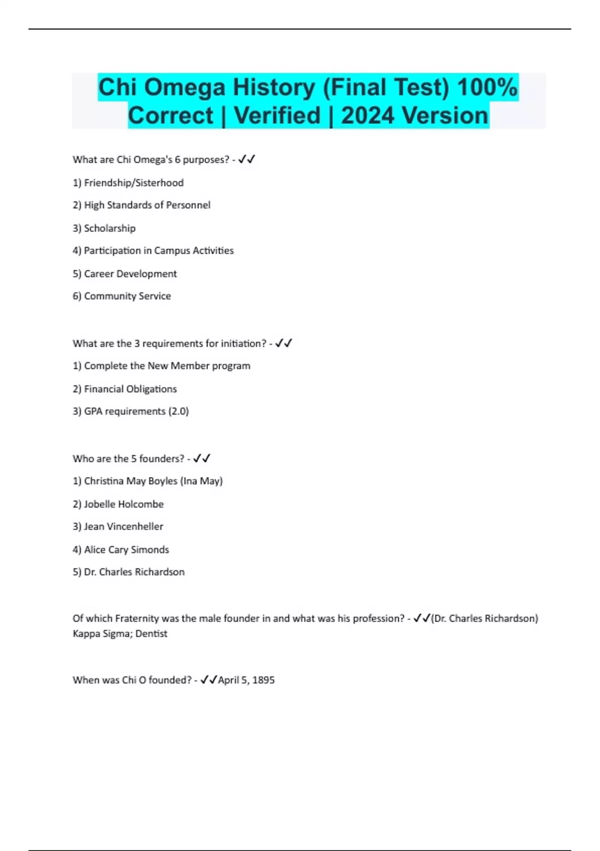Chi Omega History (Final Test) 100% Correct | Verified | 2024 Version