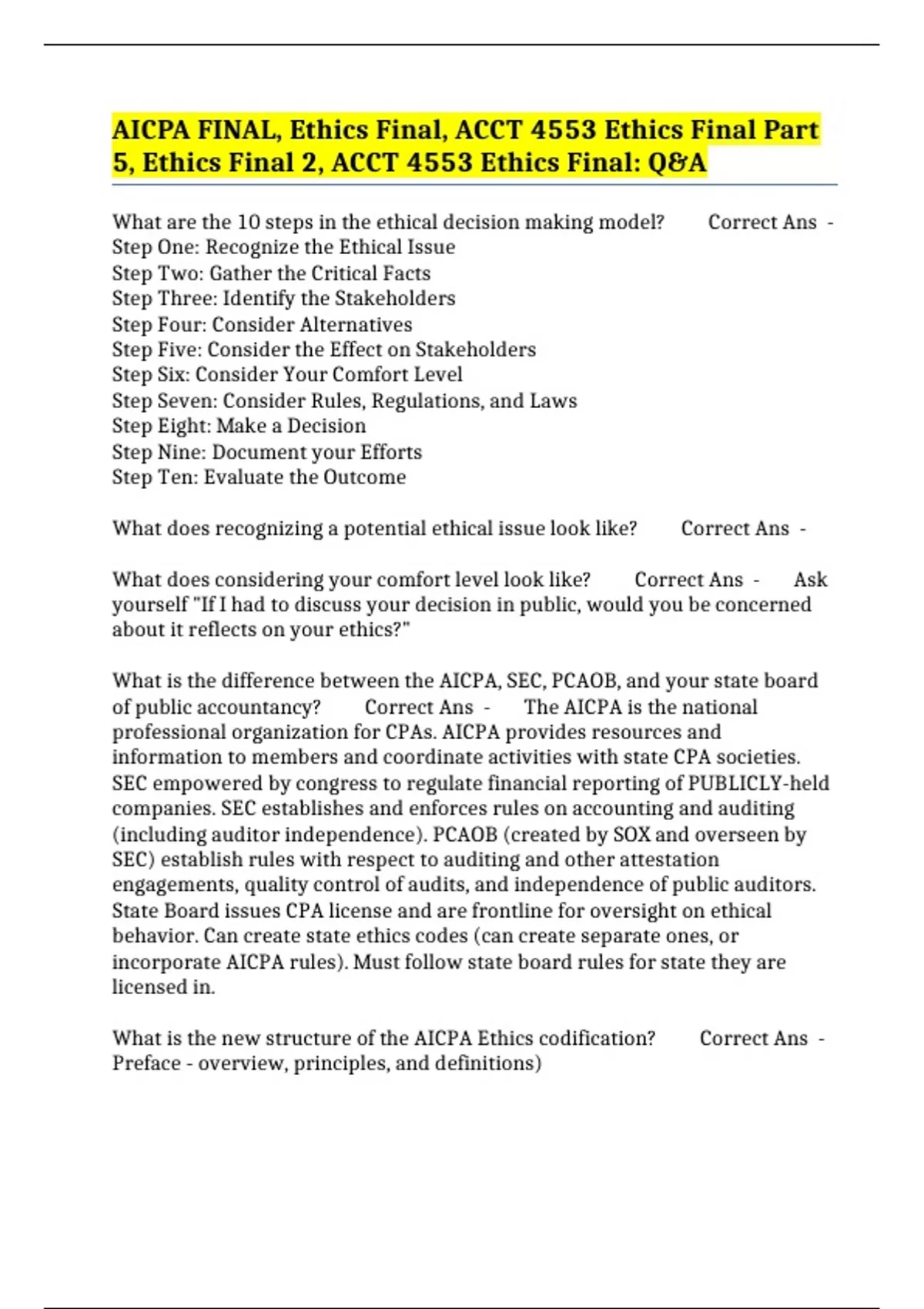 AICPA FINAL, Ethics Final, ACCT 4553 Ethics Final Part 5, Ethics Final 2, ACCT 4553 Ethics Final: Q&A