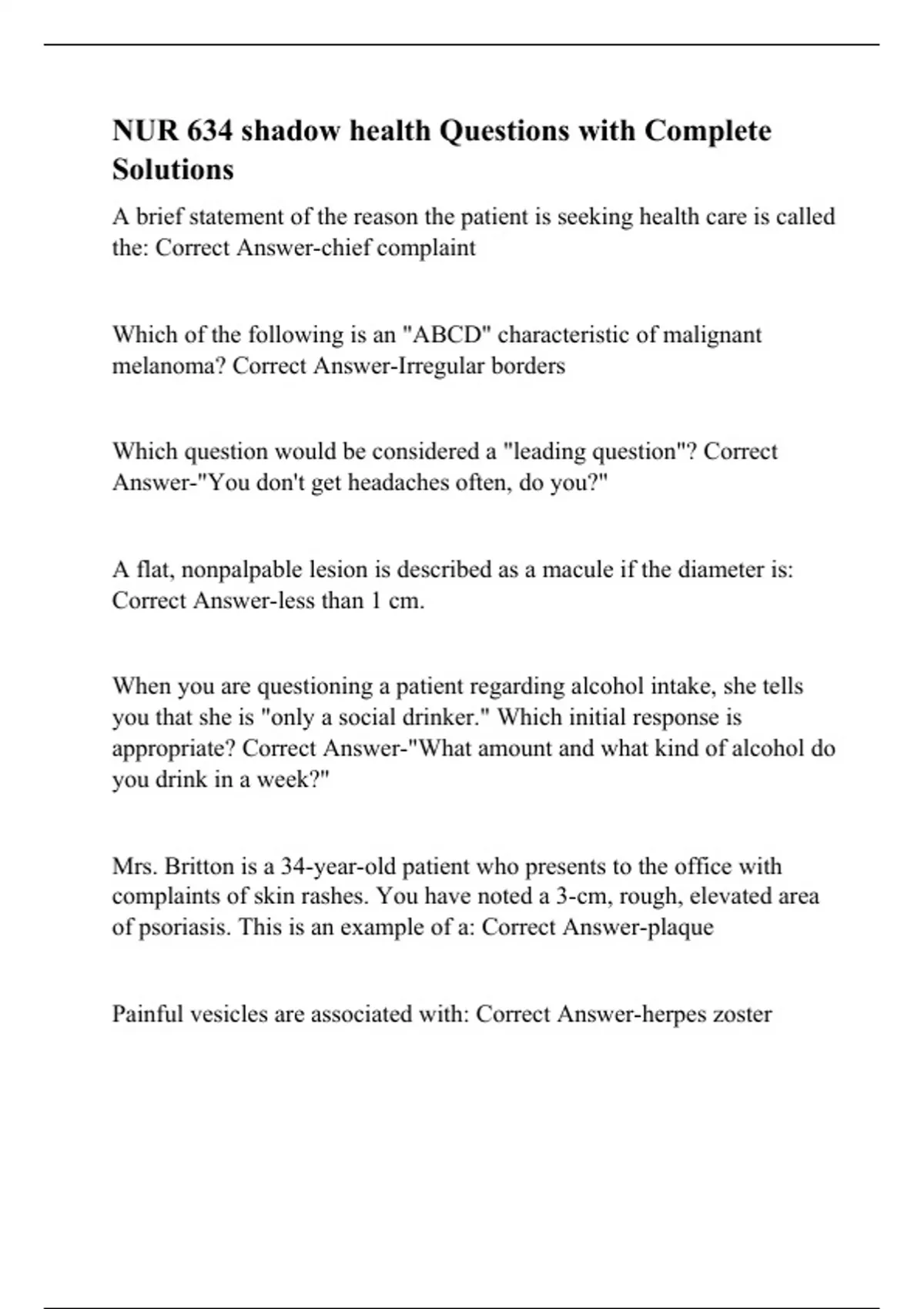 NUR 634 : - Grand Canyon University NUR 634 shadow health Questions with Complete Solutions.