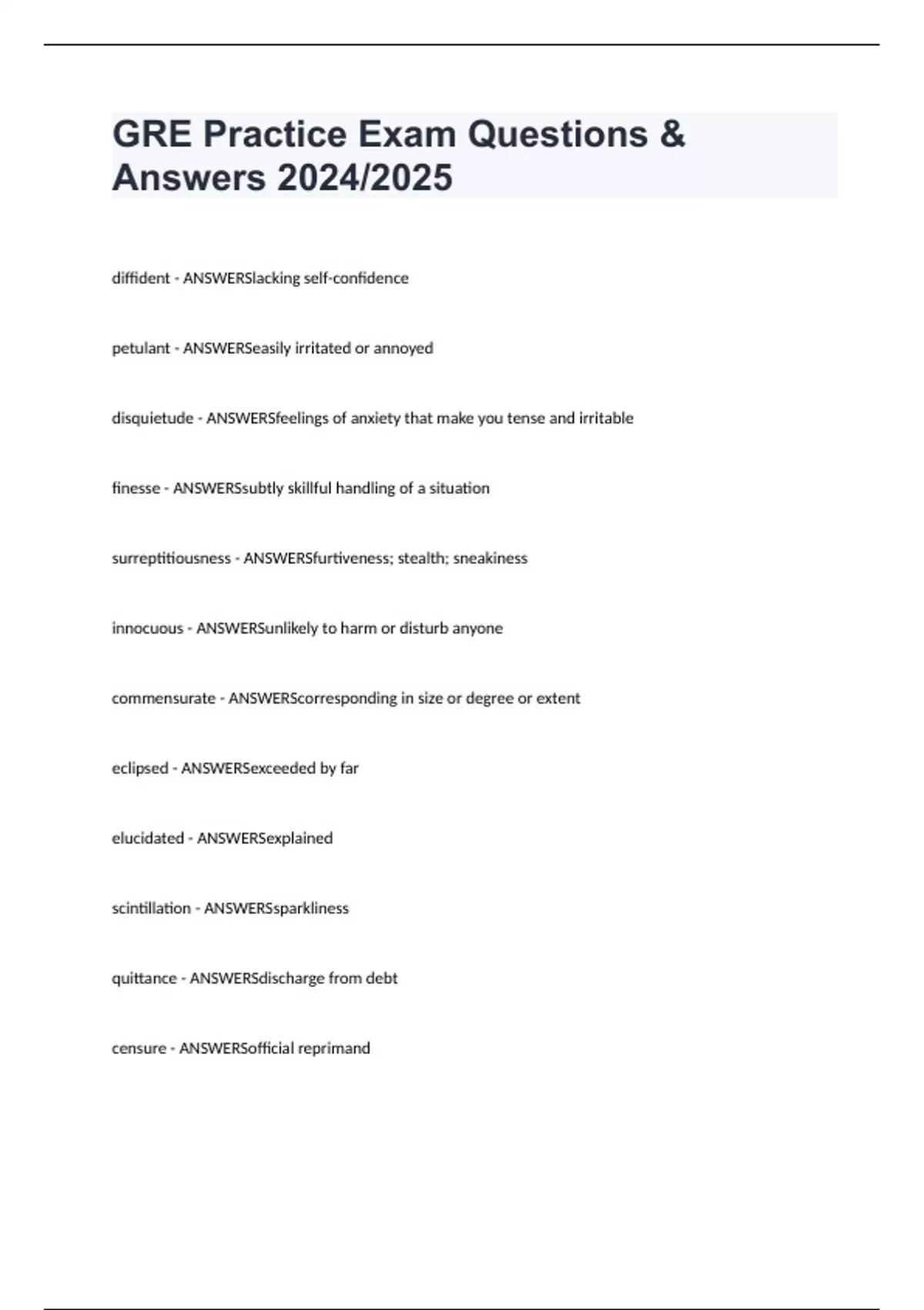 GRE Practice Exam Questions & Answers 2024/2025 diffident - ANSWERSlacking self-confidence petulant - ANSWERSeasily irritated or annoyed disquietude - ANSWERSfeelings of anxiety that make you tense and irritable finesse - ANSWERSsubtly skillful handling of a situation surreptitiousness - ANSWERSfurtiveness; stealth; sneakiness innocuous - ANSWERSunlikely to harm or disturb anyone commensurate - ANSWERScorresponding in size or degree or extent eclipsed - ANSWERSexceeded by far elucidated - ANSWERSexplained scintillation - ANSWERSsparkliness quittance - ANSWERSdischarge from debt censure - ANSWERSofficial reprimand