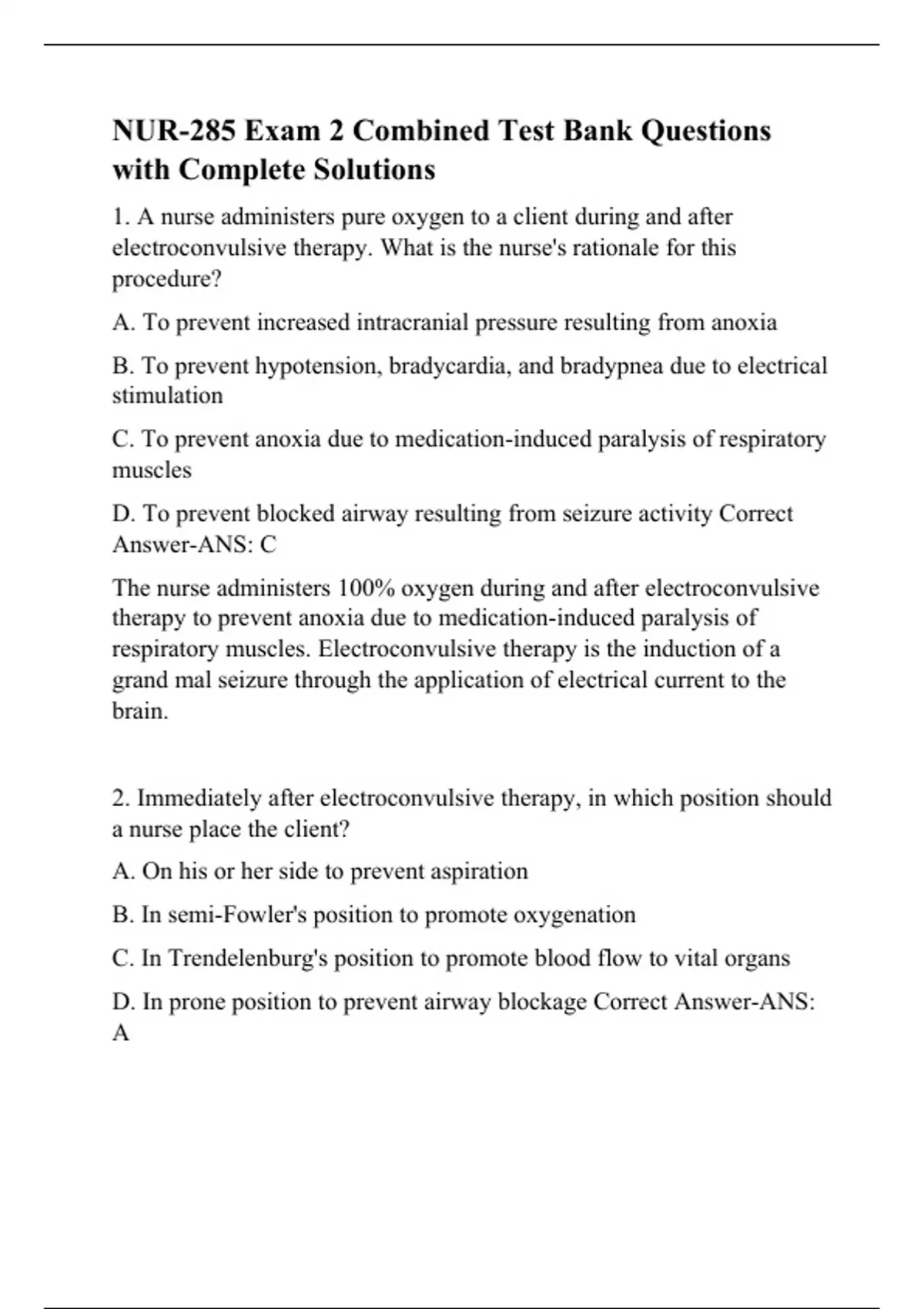 NUR-285 Exam 2 Combined Test Bank Questions with Complete Solutions