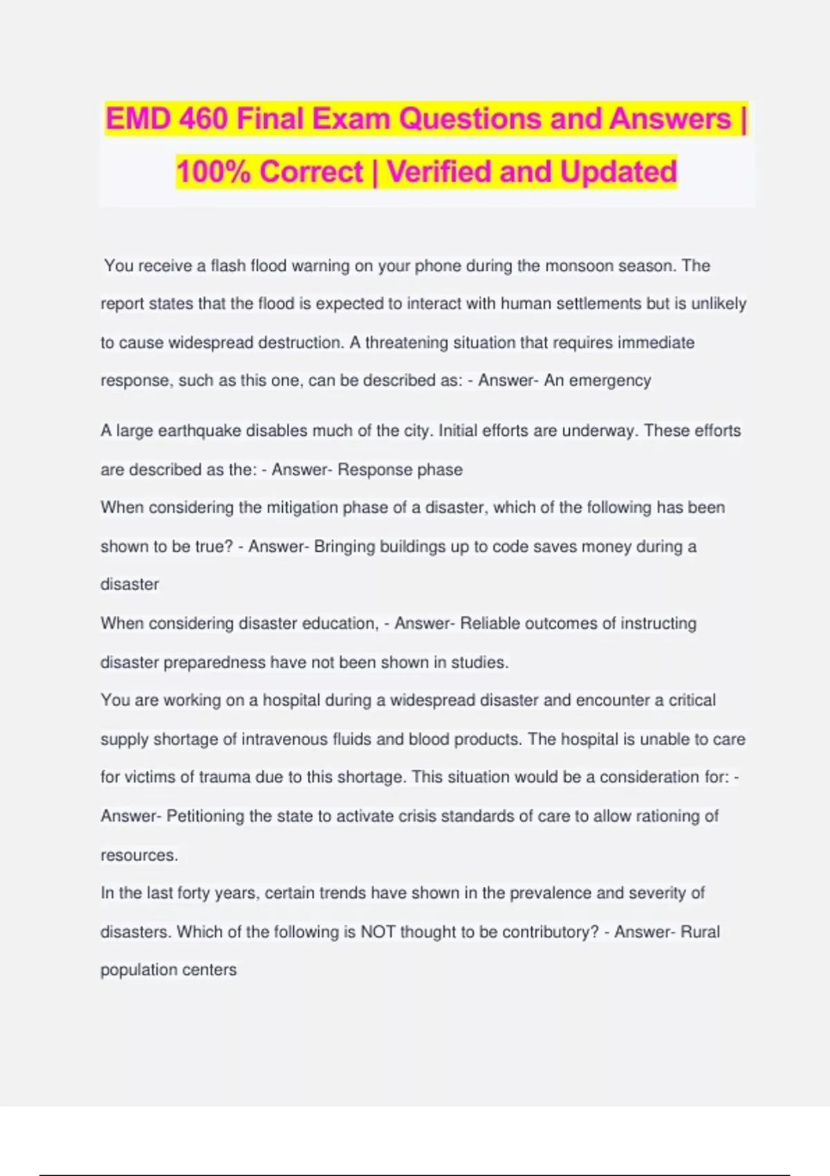 EMD 460 Final Exam Questions and Answers | 100% Correct | Verified and Updated You receive a flash flood warning on your phone during the monsoon season. The report states that the flood is expected to interact with human settlements but is unlikely to cause widespread destruction. A threatening situation that requires immediate response, such as this one, can be described as: - Answer- An emergency A large earthquake disables much of the city. Initial efforts are underway. These efforts are described as the: - Answer- Response phase When considering the mitigation phase of a disaster, which of the following has been shown to be true? - Answer- Bringing buildings up to code saves money during a disaster When considering disaster education, - Answer- Reliable outcomes of instructing disaster preparedness have not been shown in studies. You are working on a hospital during a widespread disaster and encounter a critical supply shortage of intravenous fluids and blood products. The hospital is unable to care for victims of trauma due to this shortage. This situation would be a consideration for: - Answer- Petitioning the state to activate crisis standards of care to allow rationing of resources. In the last forty years, certain trends have shown in the prevalence and severity of disasters. Which of the following is NOT thought to be contributory? - Answer- Rural population centers The Global Assessment Report (GAR) focuses primarily on which of the following topics regarding disasters in the last forty years? - Answer- The GAR recommends resilience actions, providing recommendations for mitigation to prevent disasters. A Fire-based Emergency Medical Services (EMS) system, - Answer- Merges roles of the fire department and medical services. Which job is correctly paired with tasks expected of it in an Incident Command System? - Answer- Safety Officer: Generates and implements protocols to protect staff during disaster response. Quarantine and PPE An individual with mild symptoms, not requiring hospitalization, suspected secondary to COVID-19 should undergo: - Answer- Isolation Lecture #6 Vulnerable Populations and Medical Ethics. The elderly are vulnerable population in a disaster because of: - Answer- Medical vulnerability Which of the following is NOT an ethically justifiable application of treatment of patients during crisis standards of care: - Answer- First-come, first-served Lecture #7 Disaster Behavioral Health Which of the following is FALSE regarding expected health outcomes during a disaster: - Answer- Physical symptoms are uncommon
