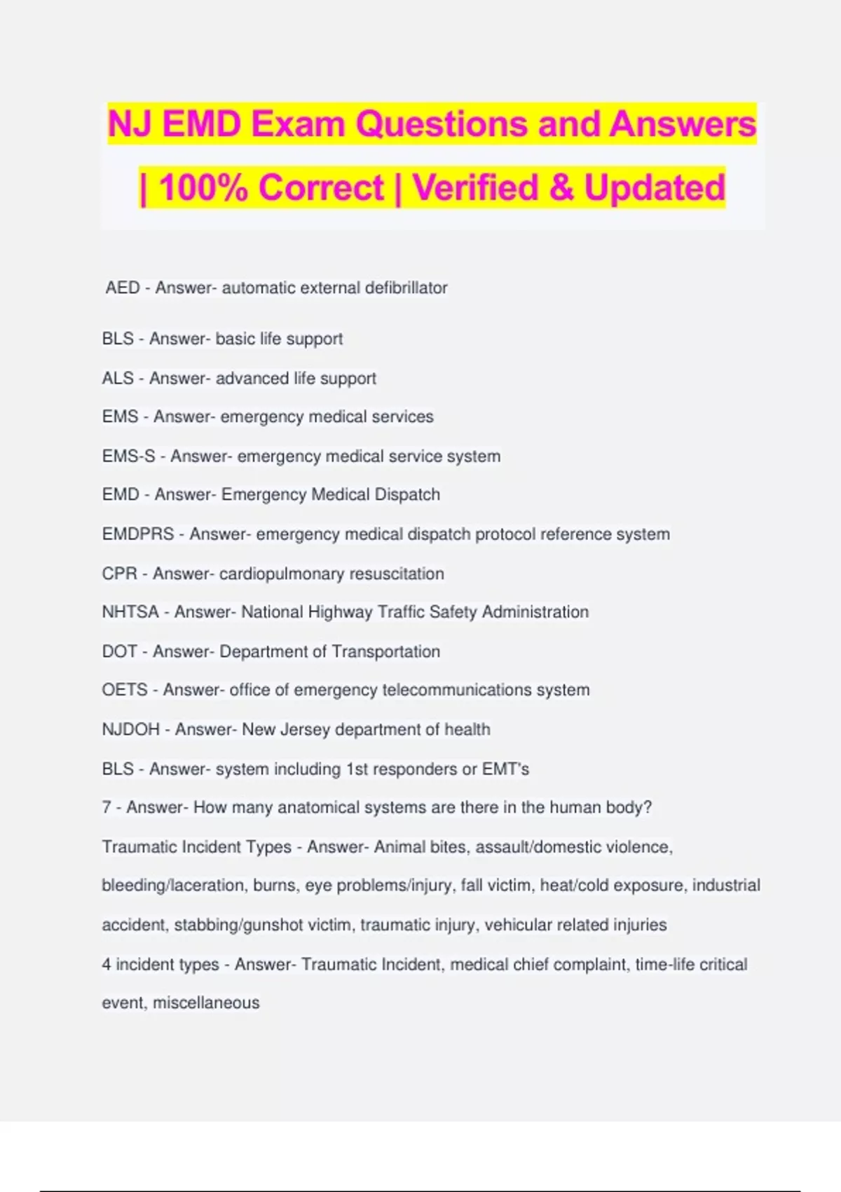NJ EMD Exam Questions and Answers | 100% Correct | Verified & Updated AED - Answer- automatic external defibrillator BLS - Answer- basic life support ALS - Answer- advanced life support EMS - Answer- emergency medical services EMS-S - Answer- emergency medical service system EMD - Answer- Emergency Medical Dispatch EMDPRS - Answer- emergency medical dispatch protocol reference system CPR - Answer- cardiopulmonary resuscitation NHTSA - Answer- National Highway Traffic Safety Administration DOT - Answer- Department of Transportation OETS - Answer- office of emergency telecommunications system NJDOH - Answer- New Jersey department of health BLS - Answer- system including 1st responders or EMT's 7 - Answer- How many anatomical systems are there in the human body? Traumatic Incident Types - Answer- Animal bites, assault/domestic violence, bleeding/laceration, burns, eye problems/injury, fall victim, heat/cold exposure, industrial accident, stabbing/gunshot victim, traumatic injury, vehicular related injuries 4 incident types - Answer- Traumatic Incident, medical chief complaint, time-life critical event, miscellaneous medical cheif complaints - Answer- abdominal pain, allergies/stings, back pain, breathing problems, chest pain/heart problems, diabetic problems, headache, OD/poisoning/ingestions, psychiatric/behavioral problems, seizures/convulsions, sick person, stroke/CVA, unknown/person down time-life controlled complaints - Answer- CO poisoning/inhalation, cardiac arrest/DOA, choking, drowning (possible), electrocution, pregnancy/childbirth, unconscious/fainting 3 cardiac arrest/choking instructions - Answer- adult child infant 2 unconscious/fainting instructions - Answer- unconscious airway control (trauma) unconscious airway control (non-trauma) miscellaneous - Answer- air medical dispatch, aircraft/terrorism, hazmat, vehicle in water TLCE - Answer- time life critical event 2 most common EMD misconceptions - Answer- callers are too upset to provide useful and accurate info callers unable to provide EMD with information necessary to dispatch EMS responsibilities of EMD - Answer- -receive and process calls for EMS assistance -determine the nature and severity of medical incidents -gives emergency medical assistance via approved EMSPRD -relay pertinent info to responding personnel -attempt to ensure safety of patients, bystanders, and personnel -gives instructions to callers (using EMDPRS) and helping them prepare for responder arrival -coordinate with other public safety and EMS servi