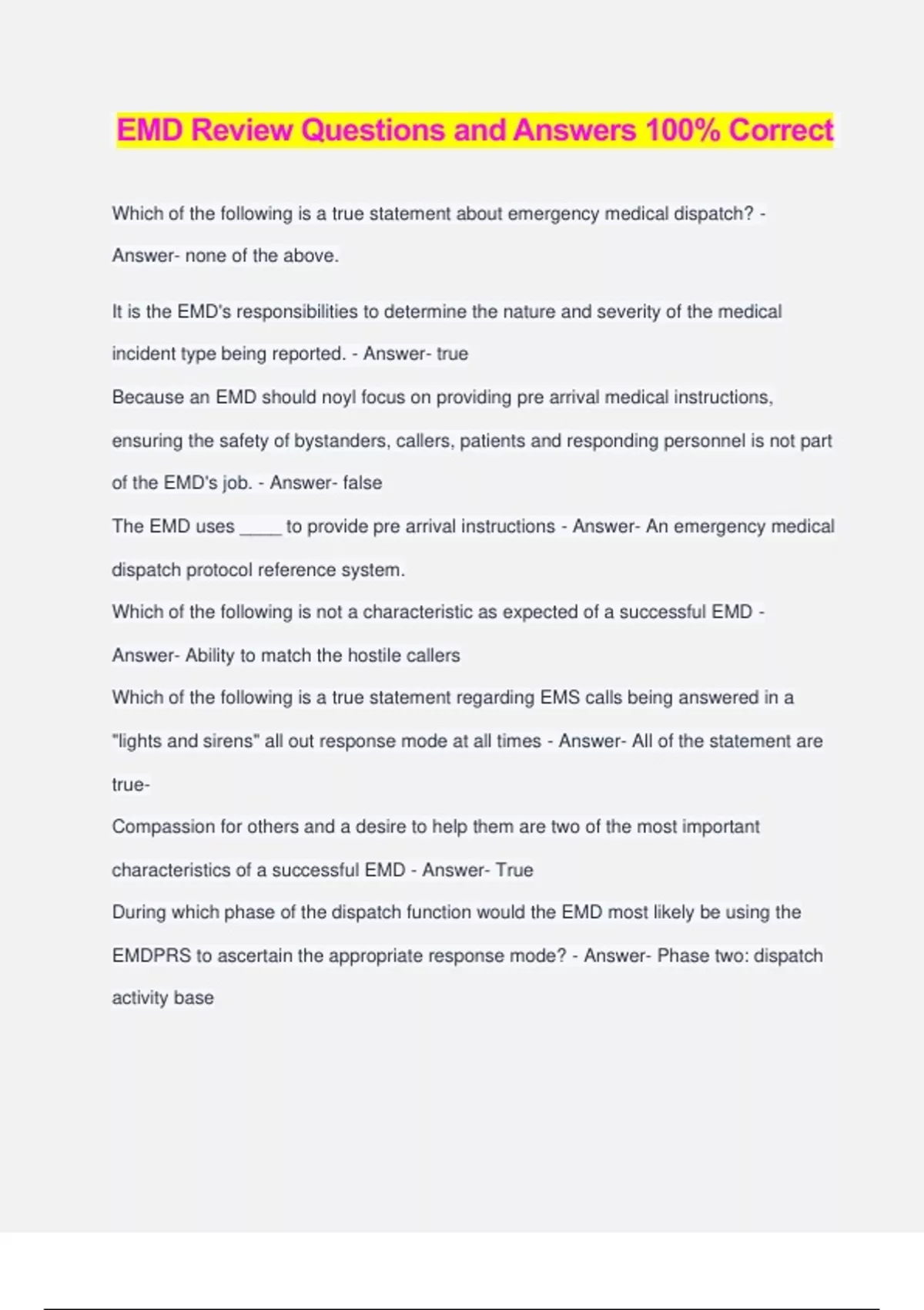EMD Review Questions and Answers 100% Correct Which of the following is a true statement about emergency medical dispatch? - Answer- none of the above. It is the EMD's responsibilities to determine the nature and severity of the medical incident type being reported. - Answer- true Because an EMD should noyl focus on providing pre arrival medical instructions, ensuring the safety of bystanders, callers, patients and responding personnel is not part of the EMD's job. - Answer- false The EMD uses ____ to provide pre arrival instructions - Answer- An emergency medical dispatch protocol reference system. Which of the following is not a characteristic as expected of a successful EMD - Answer- Ability to match the hostile callers Which of the following is a true statement regarding EMS calls being answered in a "lights and sirens" all out response mode at all times - Answer- All of the statement are true- Compassion for others and a desire to help them are two of the most important characteristics of a successful EMD - Answer- True During which phase of the dispatch function would the EMD most likely be using the EMDPRS to ascertain the appropriate response mode? - Answer- Phase two: dispatch activity base During which phase of the dispatch function would the EMD most likely be using the EMDPRS to prepare the caller for the responding personnel by providing medical instructions where appropriate? - Answer- C- Phase 3: post dispatch phase Which phase of the dispatch functions would the EMD engage the caller in the all caller interrogations sequence? - Answer- Phase 1: Call Receiving phase Which is the question that should be asked during the all caller interrogation? - Answer- C- Where did the event occur The nature of a medical emergency is determined by an EMD through - Answer- Use of the EMDPRS Emergency medical dispatch is an essential component of an EMS system because - Answer- It allows patient care to begin at the point of the initial call rather than when responders arrive at the scene Two primary purposes of EMD programs are managing EMS resources in an organized manner and providing medical assistance to callers - Answer- true If someone calls and requests information about a patient's status or name, an EMd should - Answer- Follow the agency policy and procedures for such requests An EMS system is composed entirely of basic life support, advanced life support, and emergency care facilities - Answer- false An EMS system with more than one level of response is known as - Answer- A tiered system ______ means that you are ultimately responsible for your actions - Answer- Liability Negligent conduct that was not purposeful or due to malicious intent - Answer- Simple negligence Good samaritan laws provide for some exceptions from ______ - Answer- Liability The NJ 911 Act offers those who are performing in good faith and in accordance with the law immunity from liability - Answer- False The criteria which would require the court to show a direct relationship between the action taken by an EMD and the injury to a patient - Answer- A causation Which of the following is not measured by which an EMD's behavior and conduct is judged or used to establish a "standard of care" - Answer- Behavior and conduct is judged in comparison with those acting in good faith wit