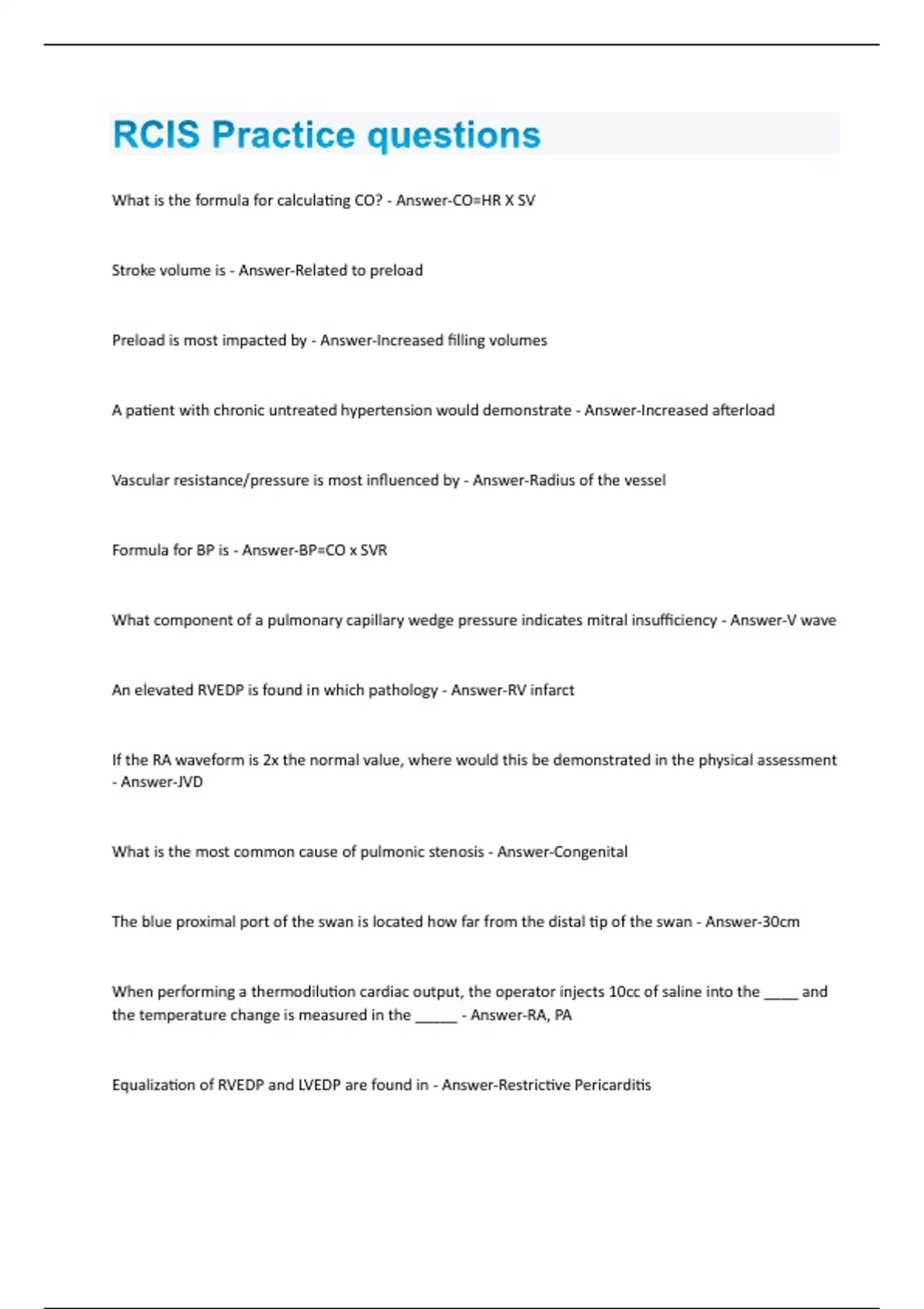 What is the formula for calculating CO? - Answer-CO=HR X SV Stroke volume is - Answer-Related to preload Preload is most impacted by - Answer-Increased filling volumes A patient with chronic untreated hypertension would demonstrate - Answer-Increased afterload Vascular resistance/pressure is most influenced by - Answer-Radius of the vessel Formula for BP is - Answer-BP=CO x SVR What component of a pulmonary capillary wedge pressure indicates mitral insufficiency - Answer-V wave An elevated RVEDP is found in which pathology - Answer-RV infarct If the RA waveform is 2x the normal value, where would this be demonstrated in the physical assessment - Answer-JVD What is the most common cause of pulmonic stenosis - Answer-Congenital The blue proximal port of the swan is located how far from the distal tip of the swan - Answer-30cm When performing a thermodilution cardiac output, the operator injects 10cc of saline into the ____ and the temperature change is measured in the _____ - Answer-RA, PA Equalization of RVEDP and LVEDP are found in - Answer-Restrictive PericarditisSigns of right sided heart failure includes - Answer-JVD The type of ASD, located in the middle 1/3 of the atrial septum is called - Answer-Ostium Secundum What is the Flamm's equation - Answer-3(SVC) + 1(IVC)/4 The formula used to calculate MAP is - Answer-1(systolic) + 2(diastolic)/3 What are the four anomalies associated with Tetralogy of Fallot - Answer-Pulmonic stenosis, over riding aorta, RVH, VSD Which fetal anomaly is characterized by a large VSD over which a large single great vessel arises - Answer-Truncas arteriosus pulsus paradoxus is a sign of - Answer-cardiac tamponade What does RAD stand for - Answer-radiation absorbed dose Which component of the X-ray system converts light rays into images - Answer-image intensifier What is the maximum annual dose of radiation one can receive annually - Answer-5 rem Lead protection should be at least how many millimeters of lead - Answer-0.5 What is the minimum safe distance to position oneself from the x-ray source - Answer-6 feet In an X-ray tube the _______________________ - Answer-cathode is negative, anode is positiveWhich view exposes the operator to the greatest amount of radiation - Answer-lateral What converts x-ray into an image - Answer-Image intensifier The contrast that is best for a patient is - Answer-Low osmolality Radiolucent means - Answer-X-rays are permitted to pass through Radiopaque means - Answer-X-rays are not permitted to pass through ReoPro works on - Answer-IIb/IIIa receptors Heparin potentiates the action of - Answer-antithrombin Fibrinogen is converted to fibrin by the action of - Answer-thrombin There are ______ known pathways to imitate the clotting cascade - Answer-2 Aspirin inhibits the action of _____ - Answer-Arachinodic Acid