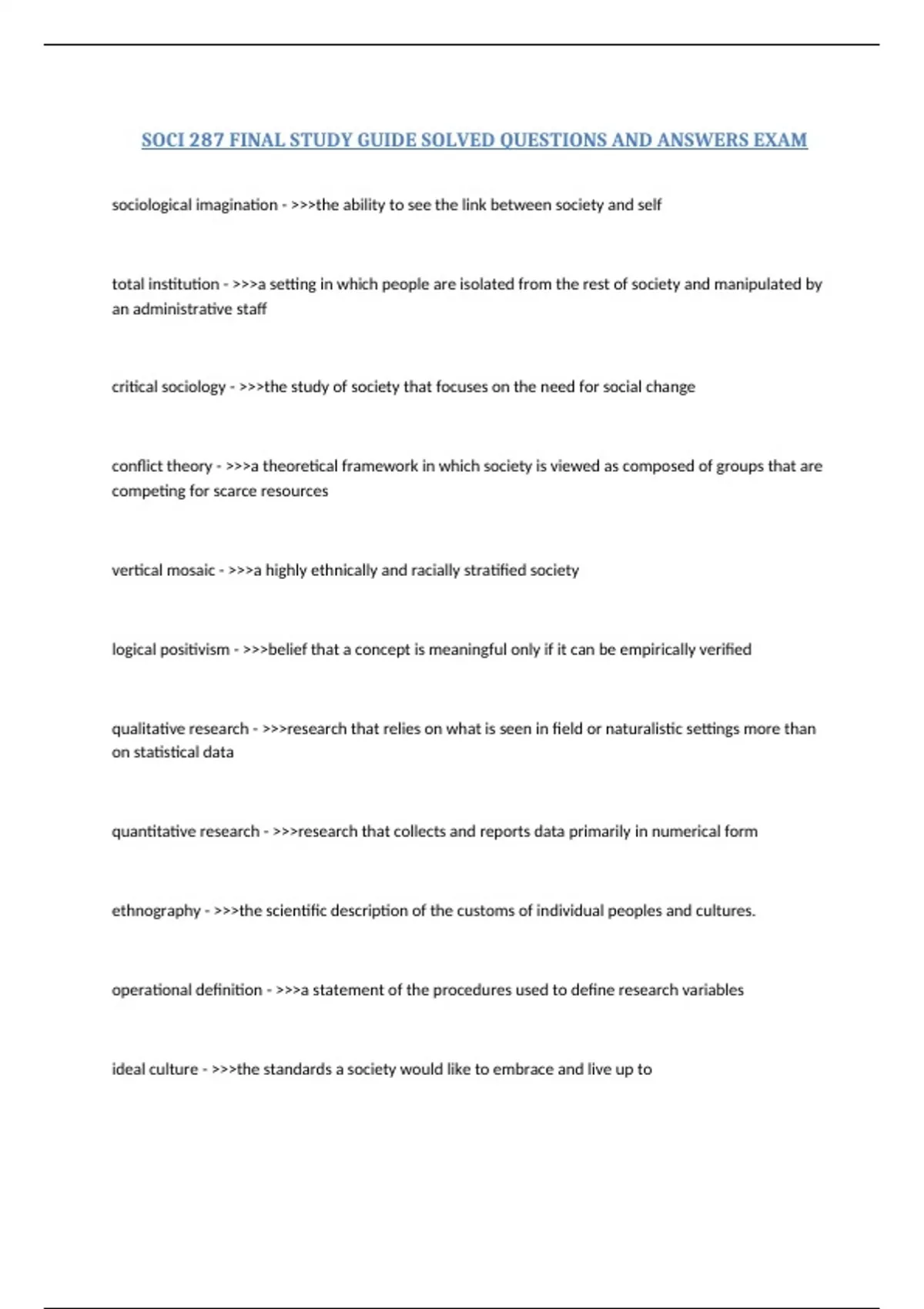 SOCI 287 FINAL STUDY GUIDE SOLVED QUESTIONS AND ANSWERS EXAM.