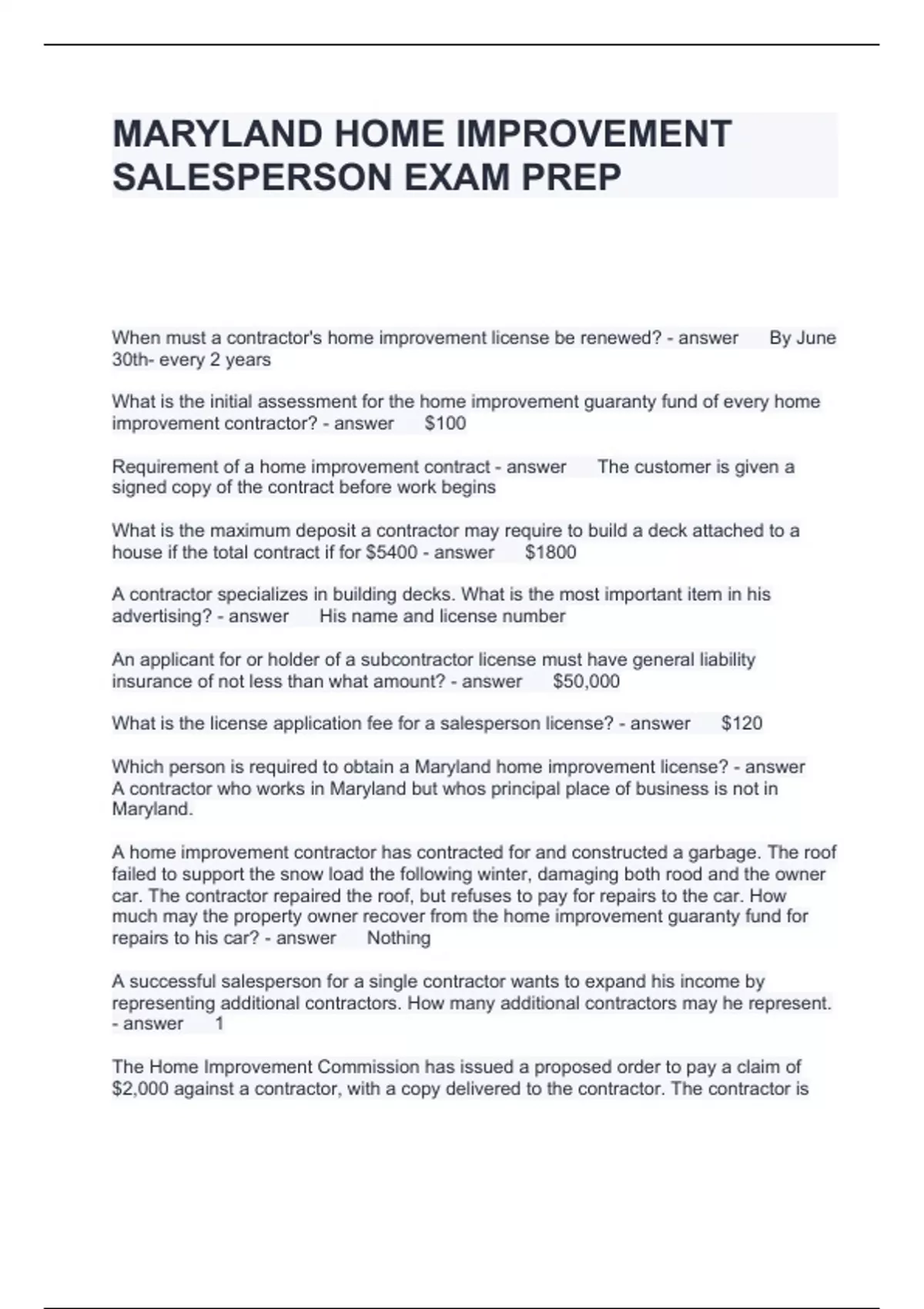 MARYLAND HOME IMPROVEMENT SALESPERSON EXAM PREP