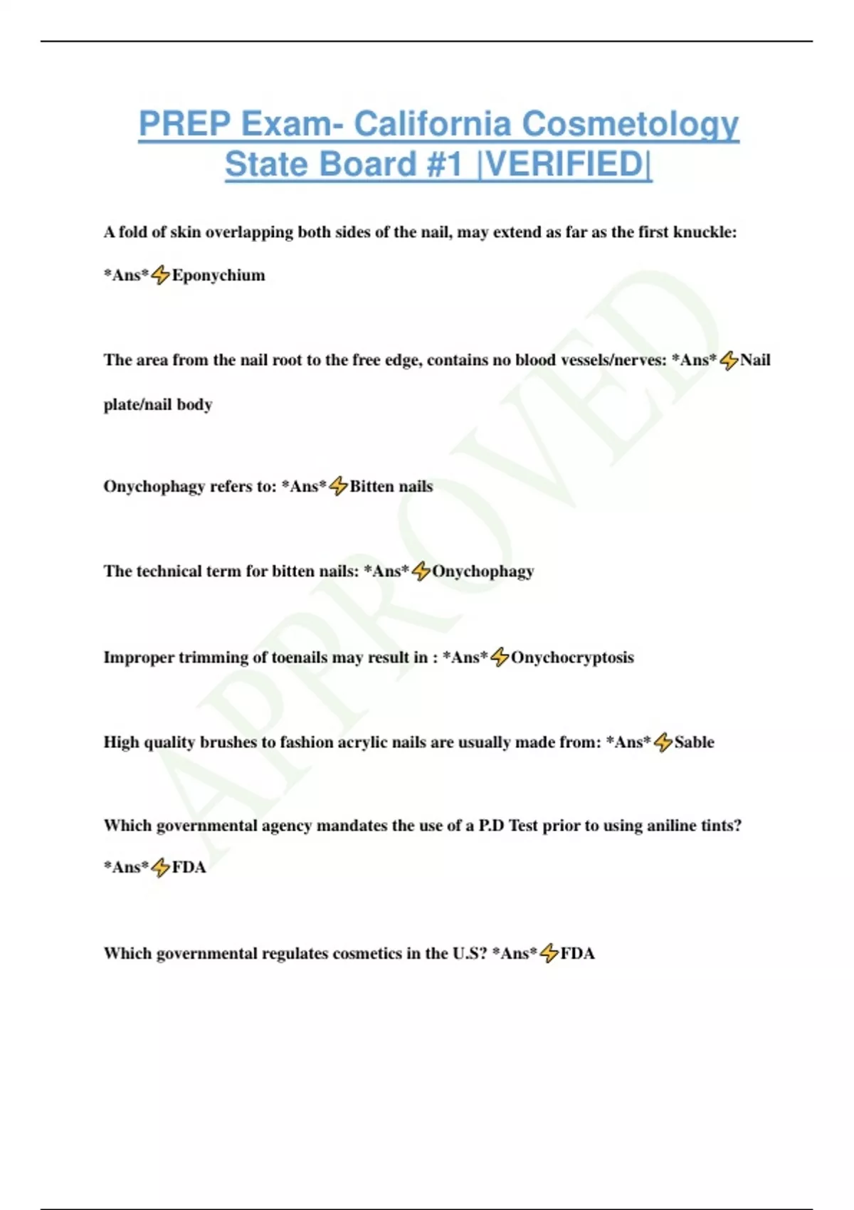 PREP Exam- California Cosmetology State Board #1 |VERIFIED| A fold of skin overlapping both sides of the nail, may extend as far as the first knuckle: *Ans* Eponychium The area from the nail root to the free edge, contains no blood vessels/nerves: *Ans* Nail plate/nail body Onychophagy refers to: *Ans* Bitten nails The technical term for bitten nails: *Ans* Onychophagy Improper trimming of toenails may result in : *Ans* Onychocryptosis High quality brushes to fashion acrylic nails are usually made from: *Ans* Sable Which governmental agency mandates the use of a P.D Test prior to using aniline tints? *Ans* FDA Which governmental regulates cosmetics in the U.S? *Ans* FDA Which agency regulates and approves the efficacy of products for infection control? *Ans* EPA Which governmental agency enforces health and safety standards for the workplace? *Ans* OSHA "Fallen Hair" is: *Ans* Non-Remy The point where the nail enters the skin at the base of the nail is referred to as: *Ans* Eponychium The tissue between the free edge of the nail (distal edge) is known as the: *Ans* Hyponychium Pterygium refers to: *Ans* Forward growth of the cuticle In the shears over comb method, holding the comb flat against the head will: *Ans* Make the hair longer The most commonly used elevations in haircutting are: *Ans* 45 degrees and 90 degrees An angle below 90 degrees, is used primarily to: *Ans* Build weight Angles above 90 degrees are used to: *Ans* Remove weight A "Blunt Cut" is sometimes referred to as: *Ans* Zero elevation, solid form, one length Double notched thinning shears: *Ans* Both blades are serrated A blunt cut is a good technique for: *Ans* Fine hair Using "double notched" shears will: *Ans* Remove less hair than single notched A uniform layered cut (same length throughout) is cut at what angle/degree? *Ans* 90 A haircut using a 0 degree/angle is referred to as: *Ans* Blunt cut, BOB, solid form Your client wants longer layers in a graduated cut, what angles/degrees would you use? *Ans* A combination of 45 and