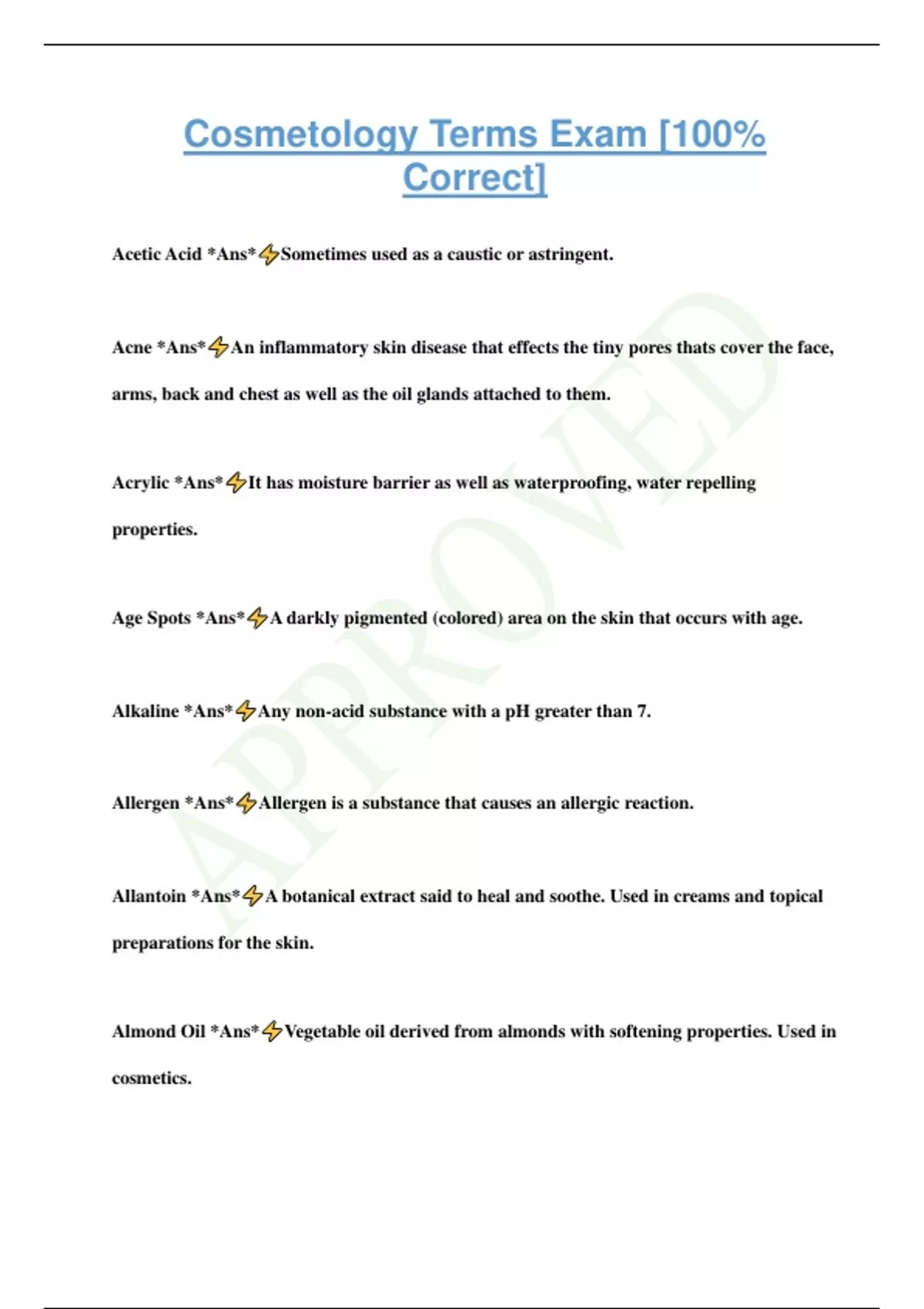 Cosmetology Terms Exam [100% Correct] Acetic Acid *Ans* Sometimes used as a caustic or astringent. Acne *Ans* An inflammatory skin disease that effects the tiny pores thats cover the face, arms, back and chest as well as the oil glands attached to them. Acrylic *Ans* It has moisture barrier as well as waterproofing, water repelling properties. Age Spots *Ans* A darkly pigmented (colored) area on the skin that occurs with age. Alkaline *Ans* Any non-acid substance with a pH greater than 7. Allergen *Ans* Allergen is a substance that causes an allergic reaction. Allantoin *Ans* A botanical extract said to heal and soothe. Used in creams and topical preparations for the skin. Almond Oil *Ans* Vegetable oil derived from almonds with softening properties. Used in cosmetics. Aloe Vera *Ans* An emollient resin with hydrating/softening properties. Alpha Hydroxy *Ans* An active substance with exfoliating and emollient properties. Althea *Ans* Botanical root believed to have emollient and soothing capabilities for skin. Astringent *Ans* Toner helpful in controlling surface oils and in lowering the pH after cleansing. Azulene *Ans* An anti-inflammatory and soothing agent, derived from German chamomile. Beeswax *Ans* One of the oldest ingredients in cosmetic preparations, traditionally used as an emulsifier. Benzoyl Peroxide *Ans* An antibacterial ingredient commonly used in acne treatments. Bergamot *Ans* This is an antiseptic and bacterial growth-inhibitor known for its toning, antiseptic an