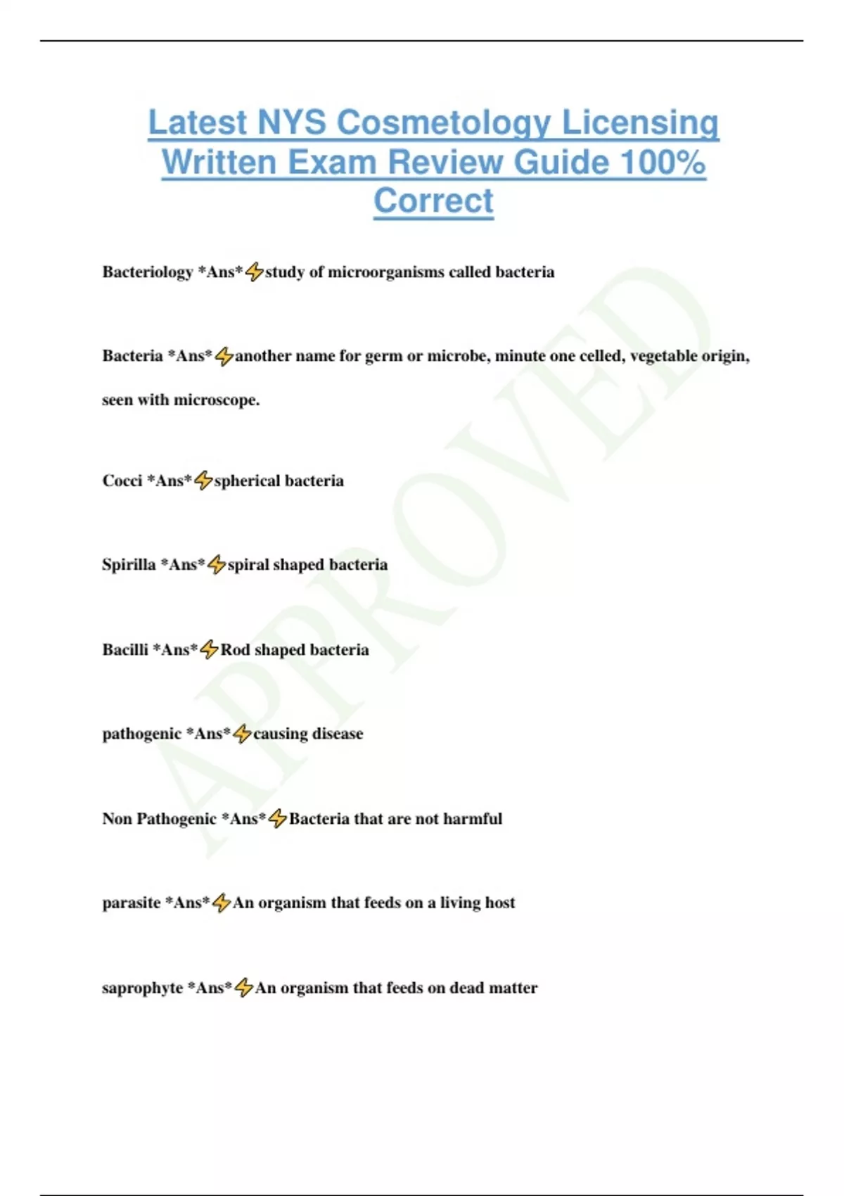 Latest NYS Cosmetology Licensing Written Exam Review Guide 100% Correct Bacteriology *Ans* study of microorganisms called bacteria Bacteria *Ans* another name for germ or microbe, minute one celled, vegetable origin, seen with microscope. Cocci *Ans* spherical bacteria Spirilla *Ans* spiral shaped bacteria Bacilli *Ans* Rod shaped bacteria pathogenic *Ans* causing disease Non Pathogenic *Ans* Bacteria that are not harmful parasite *Ans* An organism that feeds on a living host saprophyte *Ans* An organism that feeds on dead matter Human Relations *Ans* the study of how people interact in the workplace and how communication can be improved Flagella *Ans* A long, whip-like filament that helps in cell motility Mitosis *Ans* cells split in half Natural Immunity *Ans* born with immunity acquired immunity *Ans* immunity that the body develops after it overcomes a disease, or through inoculation (such as vaccination) General Infection *Ans* Occurs when the circulatory system carries bacteria and their toxins to all parts of the body Local Infection *Ans* An infection, such as a pimple or abscess, that is confined to a particular part of the body and appears as a lesion containing pus. EPA *Ans* Environmental Protection Agency MSDS *Ans* Material Safety