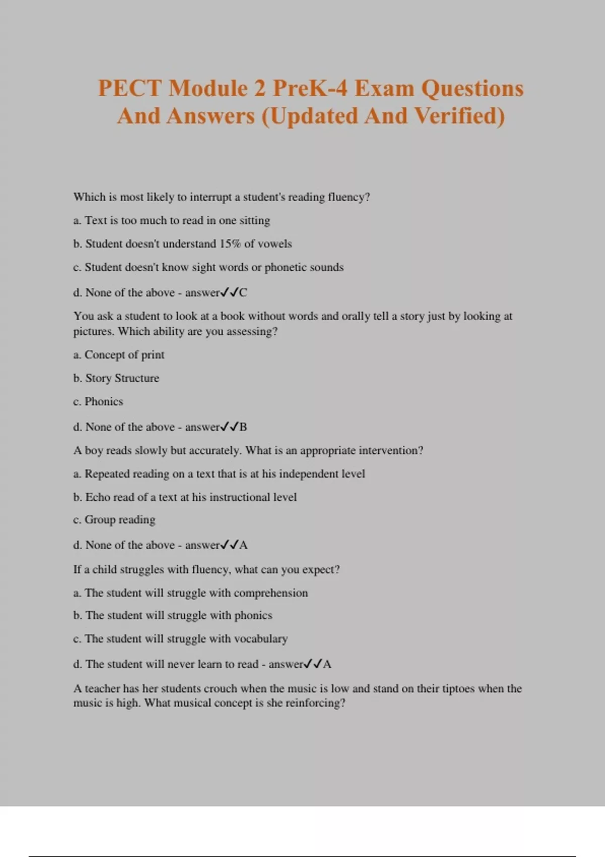 PECT Module 2 PreK-4 Exam Questions And Answers (Updated And Verified) Which is most likely to interrupt a student's reading fluency? a. Text is too much to read in one sitting b. Student doesn't understand 15% of vowels c. Student doesn't know sight words or phonetic sounds d. None of the above - answerC You ask a student to look at a book without words and orally tell a story just by looking at pictures. Which ability are you assessing? a. Concept of print b. Story Structure c. Phonics d. None of the above - answerB A boy reads slowly but accurately. What is an appropriate intervention? a. Repeated reading on a text that is at his independent level b. Echo read of a text at his instructional level c. Group reading d. None of the above - answerA If a child struggles with fluency, what can you expect? a. The student will struggle with comprehension b. The student will struggle with phonics c. The student will struggle with vocabulary d. The student will never learn to read - answerA A teacher has her students crouch when the music is low and stand on their tiptoes when the music is high. What musical concept is she reinforcing? a. Tempo b. Pitch c. Timbre d. Dynamics - answerB A class goes on a field trip to a supermarket. The produce manager explains to the class that fruits are grown in other areas and then transported to the store. Which activity would further the student's knowledge of spatial interaction? a. Research the climates of the areas the fruits come from b. Chart the different modes of transportation used to move the fruit c. Study the food traditions in the different areas d. Find the location of where different fruits are grown and map how they get to the store - answerD A first grade class visits a pet store. Once returning back to the classroom the students are broken up into various groups for different jobs. After this, the teacher holds a discussion on their activities. What topic is the teacher laying the foundation for in future years? a. Opportunity cost b. Universal needs c. Economic interdependence d. Disposable income - answerC A teacher wants to connect a science unit with social studies. The students are charting a plant's growth. Which concept is the teacher targeting? a. Time b. Continuity c. Location d. Environment - answerA Ms. Duke is teaching a small group of first grade students. She is giving them the sounds /b/ /i/ /g/ and then sweeping them together to say "big." Her group is practicing this skill with several short vowel words. What skill is Ms. Duke working on with this group? a. Alphabetic knowledge b. Print awareness c. Fluency