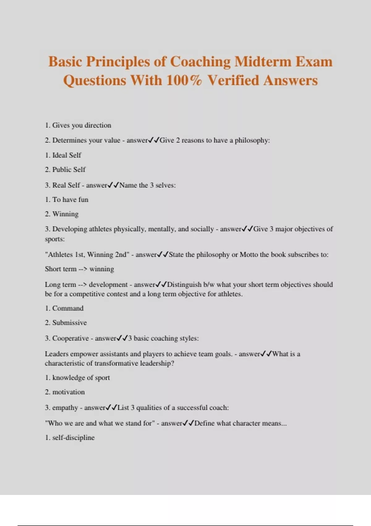 Basic Principles of Coaching Midterm Exam Questions With 100% Verified Answers 1. Gives you direction 2. Determines your value - answerGive 2 reasons to have a philosophy: 1. Ideal Self 2. Public Self 3. Real Self - answerName the 3 selves: 1. To have fun 2. Winning 3. Developing athletes physically, mentally, and socially - answerGive 3 major objectives of sports: "Athletes 1st, Winning 2nd" - answerState the philosophy or Motto the book subscribes to: Short term -- winning Long term -- development - answerDistinguish b/w what your short term objectives should be for a competitive contest and a long term objective for athletes. 1. Command 2. Submissive 3. Cooperative - answer3 basic coaching styles: Leaders empower assistants and players to achieve team goals. - answerWhat is a characteristic of transformative leadership? 1. knowledge of sport 2. motivation 3. empathy - answerList 3 qualities of a successful coach: "Who we are and what we stand for" - answerDefine what character means... 1. self-discipline