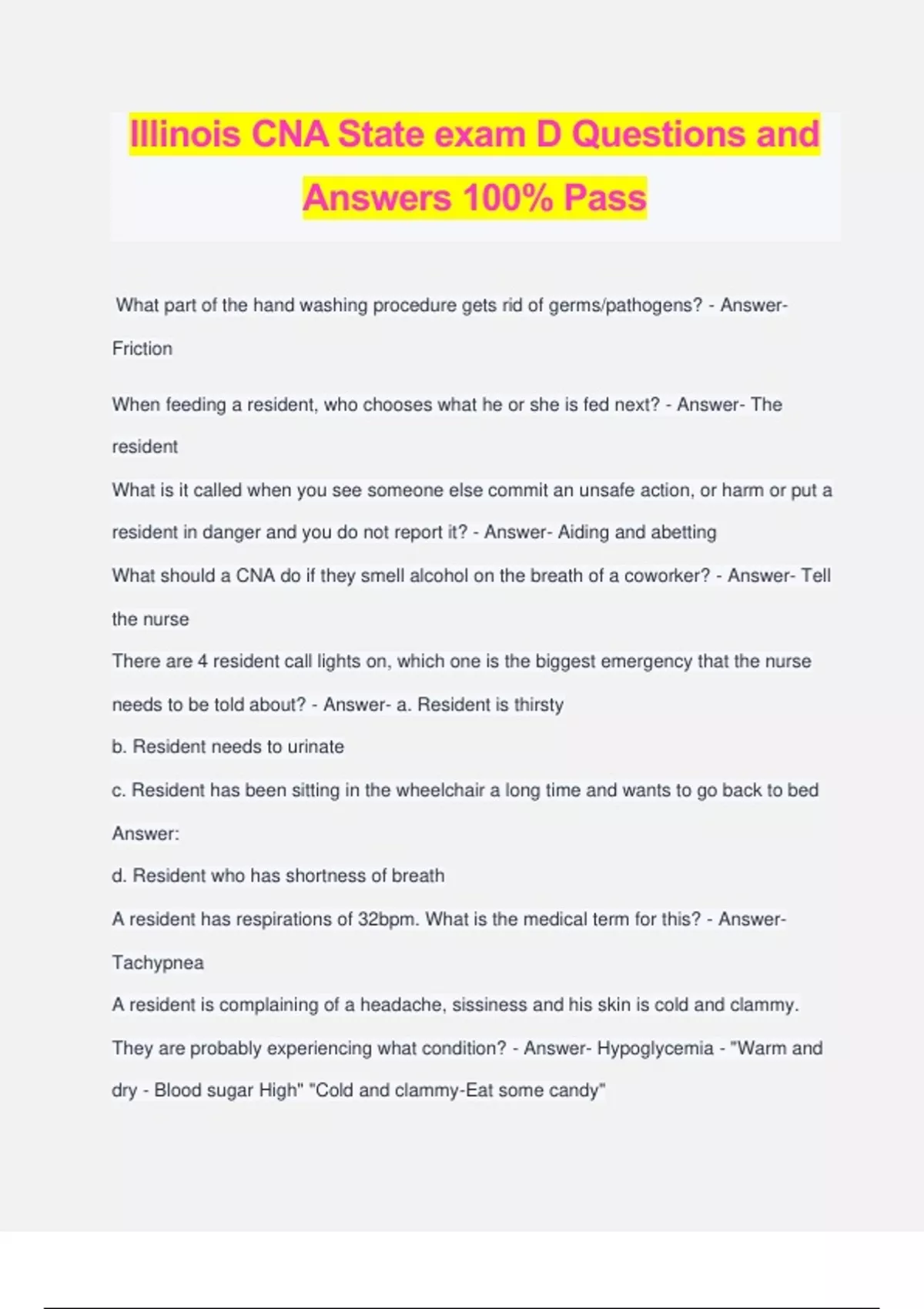 Illinois CNA State exam D Questions and Answers 100% Pass What part of the hand washing procedure gets rid of germs/pathogens? - Answer- Friction When feeding a resident, who chooses what he or she is fed next? - Answer- The resident What is it called when you see someone else commit an unsafe action, or harm or put a resident in danger and you do not report it? - Answer- Aiding and abetting What should a CNA do if they smell alcohol on the breath of a coworker? - Answer- Tell the nurse There are 4 resident call lights on, which one is the biggest emergency that the nurse needs to be told about? - Answer- a. Resident is thirsty b. Resident needs to urinate c. Resident has been sitting in the wheelchair a long time and wants to go back to bed Answer: d. Resident who has shortness of breath A resident has respirations of 32bpm. What is the medical term for this? - Answer- Tachypnea A resident is complaining of a headache, sissiness and his skin is cold and clammy. They are probably experiencing what condition? - Answer- Hypoglycemia - "Warm and dry - Blood sugar High" "Cold and clammy-Eat some candy" What is the main focus for the resident in RESTORATIVE CARE? - Answer- The resident's abilities and strengths How do you transport someone in a geriatric chair? - Answer- Push it like a wheelchair After a resident is discharged, what is the procedure called that the CNA does when cleaning a room? Wen cleaning a whirlpool bath, what do you do? - Answer- Disinfection NOT Sterilization A CNA finds a frayed cord on the call light. What should she do? - Answer- Call maintenance. Don't try an fix it. Don't use until it is fixed. Maintenance is in charge of electrical equipment and problems. A CNA checks a resident's blood pressure and gets a reading of 160/94. What should she do next? - Answer- Recheck the BP and report it to the nurse. A resident gets a call while they are at an activity, what should you do? - Answer- Take a message and have the resident call back later. You have a resident in isolation. What should you do before taking a collected specimen out of the room? - Answer- Double bag the specimen A resident has asked to use the urinal so you give it to him. What should you tell him to do when he is finished using the urinal? - Answer- Put on the call light. Not put the urinal on the bedside table In what type of urine specimen does the perineal area need to be cleaned before collecting the sample to reduce the number of microbes? - Answer- Midstream/clean catch What type of urine specimen is used for routine urinalysis and requires no special procedures for collection? - Answer- Random urine specimen