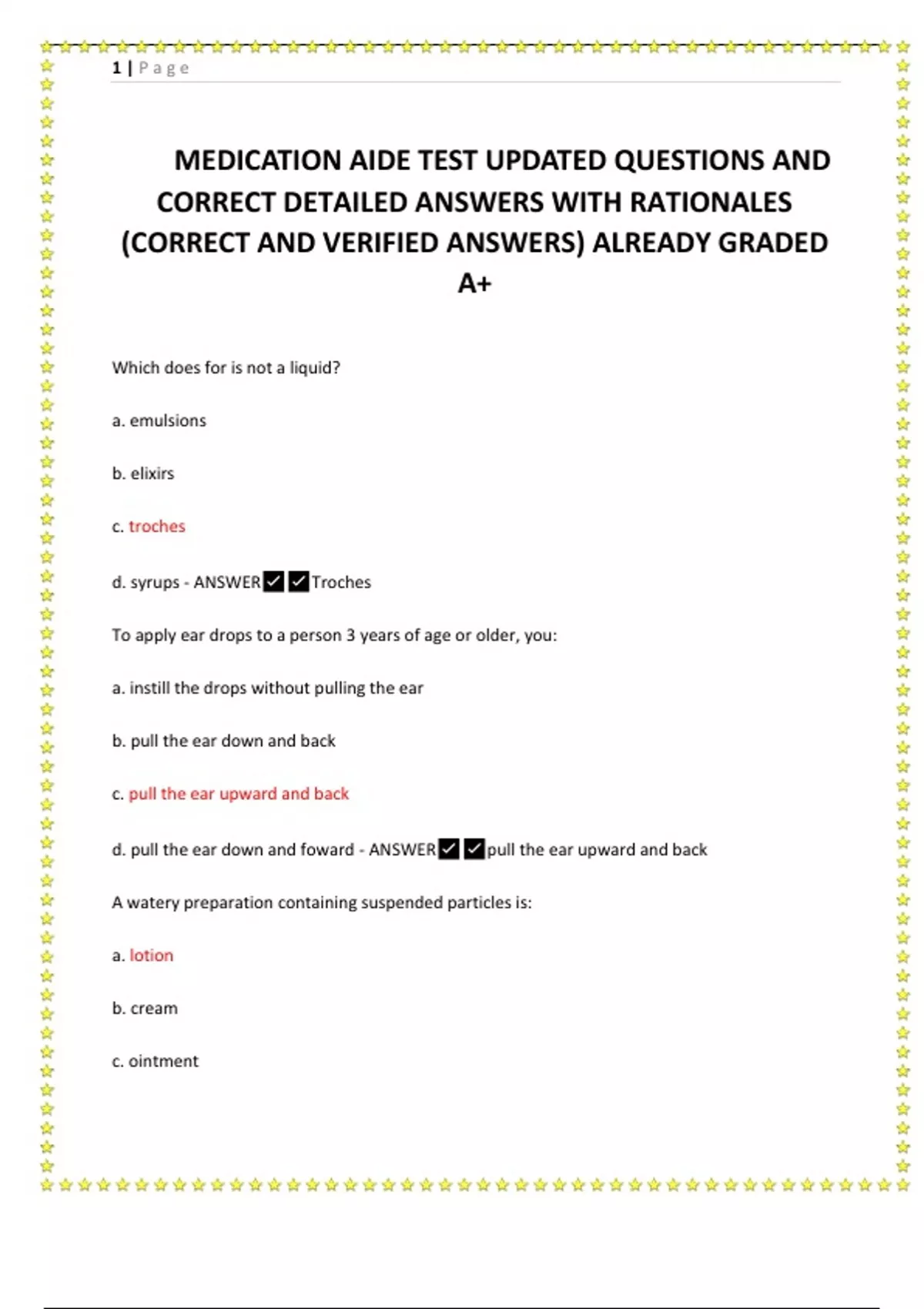 MEDICATION AIDE TEST UPDATED QUESTIONS AND CORRECT DETAILED ANSWERS WITH RATIONALES (CORRECT AND VERIFIED ANSWERS) ALREADY GRADED A+