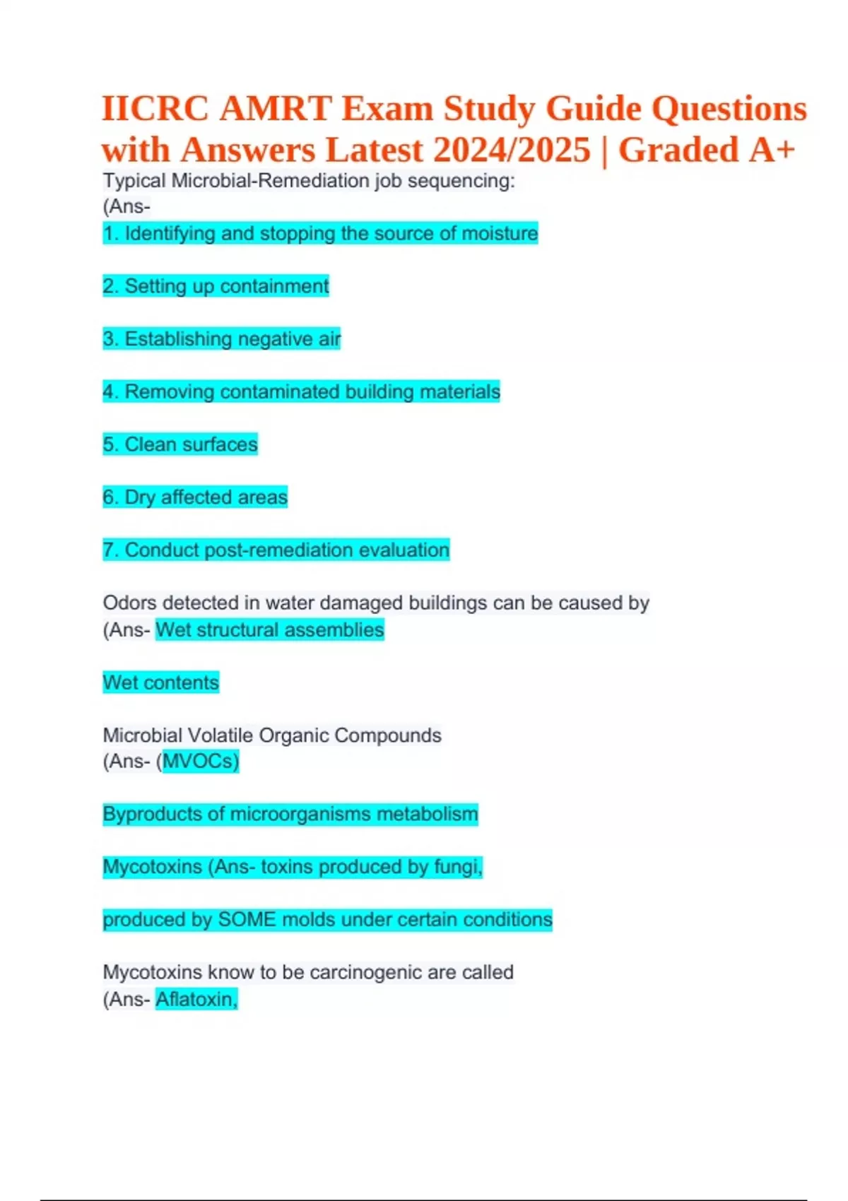 IICRC AMRT Exam Study Guide Questions with Answers Latest 2024/2025 Graded A+. Typical Microbial-Remediation job sequencing: (Ans1. Identifying and stopping the source of moisture 2. Setting up containment 3. Establishing negative air 4. Removing contaminated building materials 5. Clean surfaces 6. Dry affected areas 7. Conduct post-remediation evaluation Odors detected in water damaged buildings can be caused by (Ans- Wet structural assemblies Wet contents Microbial Volatile Organic Compounds (Ans- (MVOCs) Byproducts of microorganisms metabolism Mycotoxins (Ans- toxins produced by fungi, produced by SOME molds under certain conditions Mycotoxins know to be carcinogenic are called (Ans- Aflatoxin, IICRC AMRT Exam Study Guide Questions with Answers Latest 2024/2025 | Graded A+ can damage liver and may lead to liver cancer Mold spores are typically found to be (Ans- 2.0 to 20 microns in diameter Micron (Ans- one millionth of a meter Sporulation (Ans- Fungal organisms releasing spores into environment Viable Spores (Ans- "alive" and can start new colonies May be allergenic and/or contain toxins Settled Spores (Ans- spores that have landed on a surface and not actively growing Mycotoxins are present in (Ans- cell walls of fungal spores and hyphae Stachybotrys requires (Ans- high level of water activity Stachybotrys grows best when (Ans- in continuous contact with moisture Stachybotrys is (Ans- ONE OF MANY MYCOTOXIN PRODUCING MOLDS Genus of mold that contains around 50 different species; S.chartarum and S.chlorohalonata are some of the most dangerous and referred to as black mold or toxic black mold; linked to respiratory issues; must be disclosed Stachybotrys can begin to colonize in (Ans- 7 to 12 days Penicillium and Aspergillus (Ans- RESPIRABLE, spores can be drawn into lungs during normal breathing common examples of fungi found in remediation work XEROPHILIC Penicillium and Aspergillus can colonize in (Ans- 48 to 72 hours Xerophilic (Ans- organisms that grow in very dry environments Cryptococcus neoformans and Histoplasma capsulatum (Ans- fungi associated with BIRD and BAT droppings inhalation can result in respiratory infections Escherichia coli (E. coli) (Ans- Bacteria usually found in sewage Gram-Negative bacteria (Ans- Most common found in sewage, more pathogenic to humans than gram-Positive Produce endotoxins in their cell walls which are hazardous when ingested/inhaled Virus do not reproduce, (Ans- they REPLICATE by invading living cells and turning them into virus factories to grow "Dry Rot" fungi, (Ans- at least 20% moisture content is required Water activity (Aw) (Ans- amount of moisture available in food for growth Equilibrium Relative Humidity (ERH) (Ans- Aw X 100% Control moisture and prevent mold growth by (Ans- keeping materials dry and if they become wet, dry them quickly