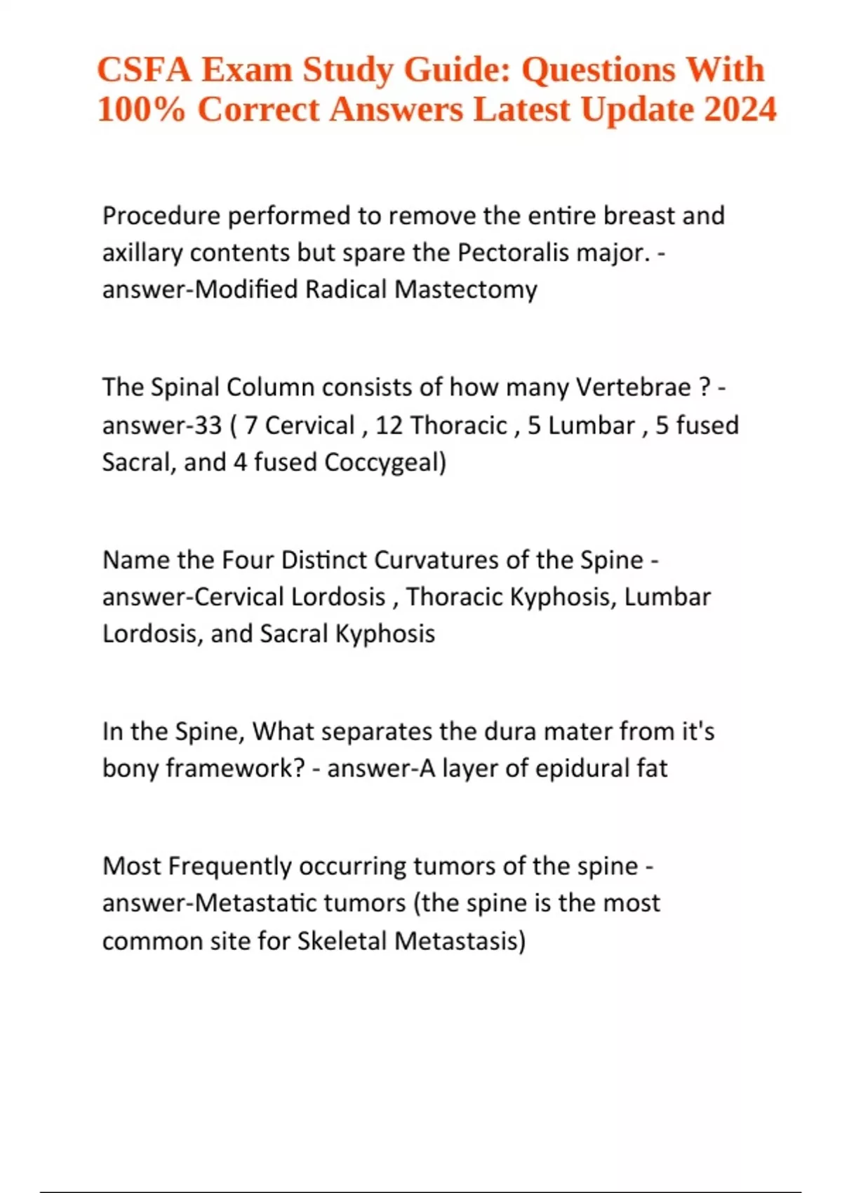 CSFA Exam Study Guide: Questions With 100% Correct Answers Latest Update 2024 Graded A+. Procedure performed to remove the entire breast and axillary contents but spare the Pectoralis major. - answer-Modified Radical Mastectomy The Spinal Column consists of how many Vertebrae ? - answer-33 ( 7 Cervical , 12 Thoracic , 5 Lumbar , 5 fused Sacral, and 4 fused Coccygeal) Name the Four Distinct Curvatures of the Spine - answer-Cervical Lordosis , Thoracic Kyphosis, Lumbar Lordosis, and Sacral Kyphosis In the Spine, What separates the dura mater from it's bony framework? - answer-A layer of epidural fat Most Frequently occurring tumors of the spine - answer-Metastatic tumors (the spine is the most common site for Skeletal Metastasis) CSFA Exam Study Guide: Questions With 100% Correct Answers Latest Update 2024 (!!!) Newborn Vomiting, free of bile, and projectile in nature is indicative of what diagnosis ? - answer-Pyloric Stenosis Neurological Disorder, characterized by excruciating , "piercing" pain in the face is indicative of what diagnosis ? - answer-Trigeminal Neuralgia Neurotransmitter/Hormone that mediates impulse transmission at most Post-ganglionic Sympathetic Nerve endings - answer-Norepinephrine (noradrenaline) Neurotransmitter at all parasympathetic and preganglionic sympathetic neurons - answer-Acetylcholine The Right subclavian artery is a branch of what preceding Vessel ? - answer-The Brachiocephalic trunk (aka The innominate Artery) The wall of the heart consists of how many layers ? - answer-3 ( epicardium or pericardium, myocardium , endocardium) The vein that drains the Right Side of the Vertebral column - answer-The Azygos Vein Device used to siphon off excess CSF into the abdomen thereby decreasing intracranial pressure - answerVP(vetriculo-peritoneal) shunt Veins that drain the intracranial sinuses to veins outside of the skull - answer-Emissary Veins Disorder characterized by a compression of the Abductor Pollicis Longus and Extensor Pollicis Brevis Tendons near the radial styloid process - answer-De Quervain's Tenosynovitis Following an injury to the lower limb, the patients lower leg can easily be displaced anteriorly on a fixed thigh, this is indicative of injury to what structure? - answer-ACL (anterior cruciate ligament) tear Most frequently injured tendon of the rotator cuff - answer-The supraspinatus (aka supraspinous) tendon Typical Potassium levels - answer-3.5 - 5.5 mEq/L ( you buy bananas in bunches of 3 - 5)(lab value ranges can vary from lab to lab) Typical blood PH - answer-7.35 - 7.45 (lab value ranges can vary from lab to lab) Suture technique used to relieve tension on a handsewn bowel anastomosis - answer-Lembert Where are intercostal nerves and vessels located in relation to an individual rib? - answer-On the Inferior surface of the rib Avascular area of Mesentery that is helpful in locating the Middle colic Artery (a branch of the SMA) - answerThe Space of Riolan A civil wrong committed against a person or property (does not include breaches of contract) - answer-Tort Most common Hernia variation in Females - answerIndirect Inguinal Hernia A sigmoid colostomy is brought to the skins surface through which muscle? - answer-The Rectus Abdominus (this results in lower incidences of peristomal hernias postoperatively) The nourishing coat of the eye that consists mainly of blood vessels - answer-The Choroid The Head of the Pancreas, is surrounded by what alimentary structure? - answer-The Duodenum Legal principle that holds everyone responsible for their own acts of negligence - answer-The principle of Personal Liability A patient presenting with Increased WBC , Bilirubin, Alkaline phosphatase and positive blood cultures is likely suffering from.... - answer-Cholangitis ( an inflammation of the Bile duct system) The most common cancer of the Liver is ? - answerMetastatic disease The most common primary malignant disease of the Liver is? - answer-Hepatocellular Carcinoma (accounts for 85% of all primary malignancies of the liver) If a Meckel's diverticulum were suspected, where should we look for it? - answer-two feet proximal to the Ileocecal valve or ICV A pair of lateral apertures that are one of three sites that CSF can enter the subarachnoid space - answerForamen of Luschka Dumping Syndrome is a possible complication of what Bariatric procedure? - answer-Gastric Bypass In which procedure would the patient be in the Supine position with their right side slightly elevated by a wedge? - answer-C-section (this is done to reduce the pressure the uterus imparts upon the Vena cava) Procedure in which all external female genital organs are removed including the clitoris , labia, vaginal introitus and nearby lymph nodes as well as skin and subcutaneous tissue. - answer-Radical Vulvectomy