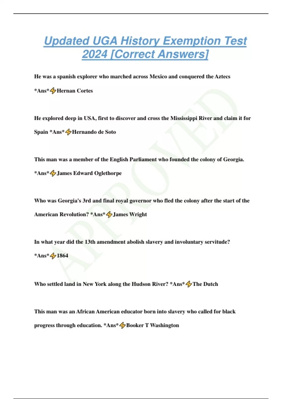 Updated UGA History Exemption Test 2024 [Correct Answers] He was a spanish explorer who marched across Mexico and conquered the Aztecs *Ans* Hernan Cortes He explored deep in USA, first to discover and cross the Mississippi River and claim it for Spain *Ans* Hernando de Soto This man was a member of the English Parliament who founded the colony of Georgia. *Ans* James Edward Oglethorpe Who was Georgia's 3rd and final royal governor who fled the colony after the start of the American Revolution? *Ans* James Wright In what year did the 13th amendment abolish slavery and involuntary servitude? *Ans* 1864 Who settled land in New York along the Hudson River? *Ans* The Dutch This man was an African American educator born into slavery who called for black progress through education. *Ans* Booker T Washington Act of Congress that created and established the Federal Reserve System, the central banking system of the United States, and granted it the legal authority to issue Federal Reserve Notes, and Federal Reserve Bank Notes as legal tender. *Ans* Federal Reserve Act In what year was the Federal Reserve Act ratified? *Ans* 1913 What machine automated cotton processing and INCREASED the need for slaves? *Ans* Cotton Gin This man was a quaker who founded Pennsylvania. He wanted to unite all of the UA colonies and pushed for democracy and religious freedom. *Ans* William Penn What was Georgia's fourth capital and seat of the state government during the Civil War ()? *Ans* Milledgeville In 1832 SC argued that the federal tariffs were unconstitutional and President Jackson sent Troops to force SC to pay tariffs. *Ans* Nullification Crisis In 1925 a substitute teacher was accused of violating Tennessee's Butler Act *Ans* Scopes Trial