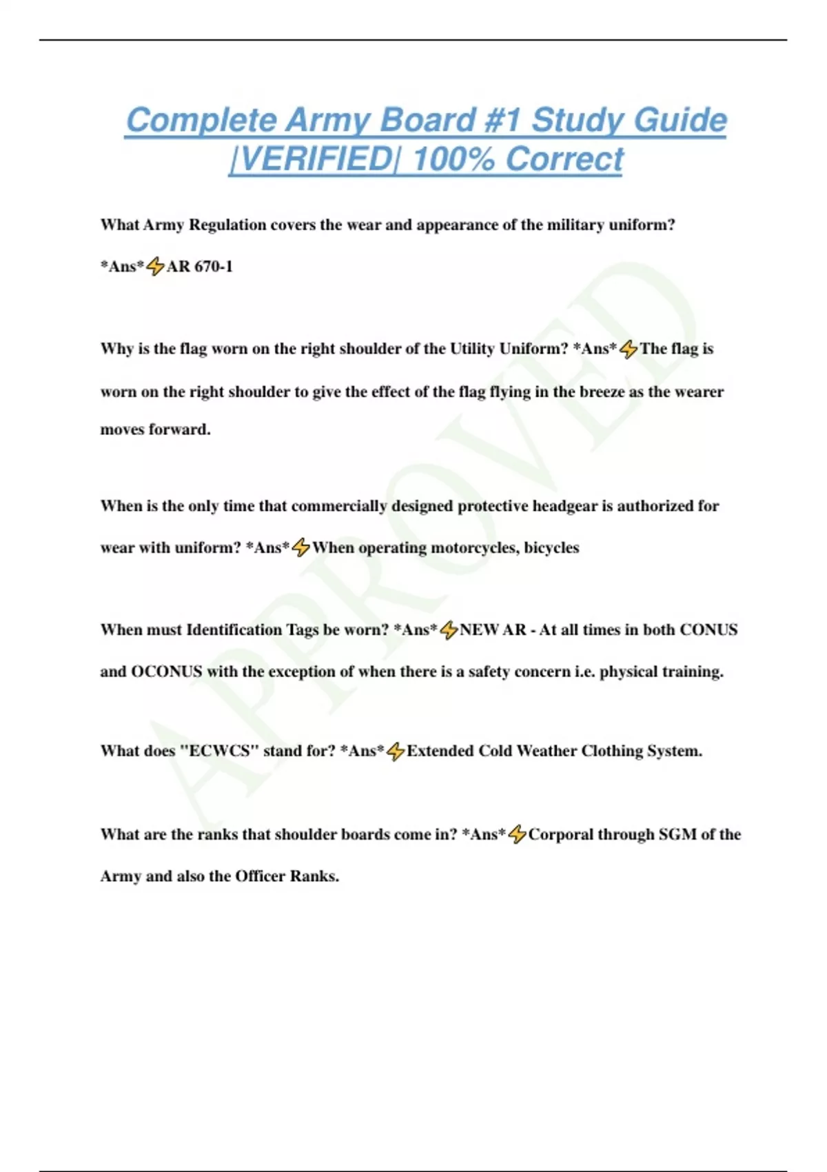 Complete Army Board #1 Study Guide |VERIFIED| 100% Correct What Army Regulation covers the wear and appearance of the military uniform? *Ans* AR 670-1 Why is the flag worn on the right shoulder of the Utility Uniform? *Ans* The flag is worn on the right shoulder to give the effect of the flag flying in the breeze as the wearer moves forward. When is the only time that commercially designed protective headgear is authorized for wear with uniform? *Ans* When operating motorcycles, bicycles When must Identification Tags be worn? *Ans* NEW AR - At all times in both CONUS and OCONUS with the exception of when there is a safety concern i.e. physical training. What does "ECWCS" stand for? *Ans* Extended Cold Weather Clothing System. What are the ranks that shoulder boards come in? *Ans* Corporal through SGM of the Army and also the Officer Ranks. How is the beret properly worn? *Ans* The beret is worn so that the headband (edge binding) is straight across the forehead, 1inch above the eyebrows. The flash is positioned over the left eye, and the excess material is draped over to the right ear, extending to at least the top of the ear, and no lower than the middle of the ear. Who is authorized to wear insignia of branch on the Patrol cap? *Ans* Chaplains. What are the dimensions of the dress uniform nameplate? *Ans* 1 x 3 x 1/16 of an inch. How many marksmanship badges are authorized for wear at one time on the Army Blue Service Uniform? *Ans* No more than 3. (AR 670-1 Feb 2005 / 29-16 / PDF 306) What is the most noticeable difference between the Army Blue Service Uniform trousers worn by Soldiers in the ranks of PVT through SPC and those worn by NCOs? *Ans* gold stripe along the legs How will service ribbons be worn on the male Army Blue Service uniform? *Ans* The ribbons centered 1/8 inch above the left breast pocket. How is the Regimental Distinctive Insignia (RDI) worn on the male Army Blue Service Uniform? *Ans* 1/4 inch above any unit awards or foreign badges that are worn.