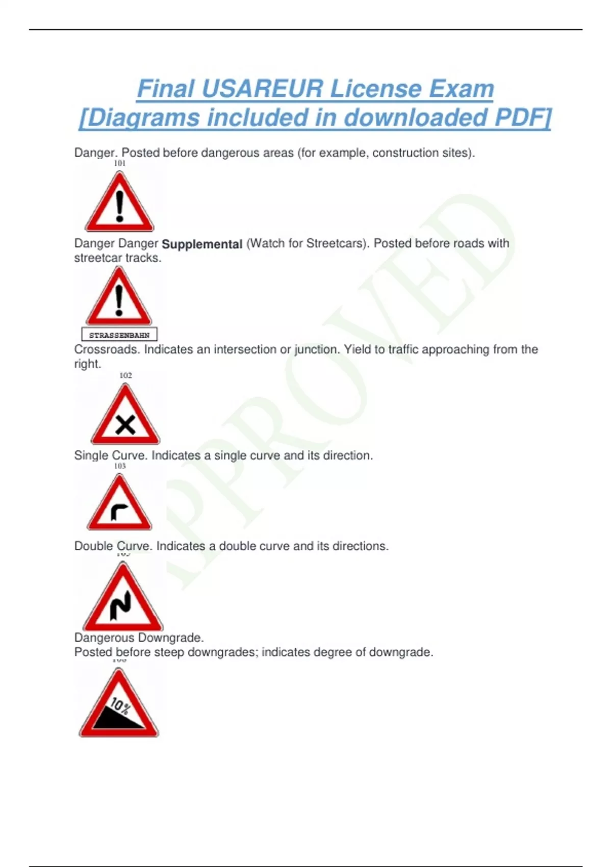 Final USAREUR License Exam [Diagrams included in downloaded PDF] Danger. Posted before dangerous areas (for example, construction sites). Danger Danger Supplemental (Watch for Streetcars). Posted before roads with streetcar tracks. Crossroads. Indicates an intersection or junction. Yield to traffic approaching from the right. Single Curve. Indicates a single curve and its direction. Double Curve. Indicates a double curve and its directions. Dangerous Downgrade. Posted before steep downgrades; indicates degree of downgrade. Dangerous Upgrade. Posted before steep upgrades; indicates degree of upgrade. Rough Road. Indicates uneven stretches of road. Beware of Ice. Indicates that areas ahead freeze easily (for example, bridges, shaded or wooded areas). Slippery Road. Indicates stretches of road that may be slippery when wet or dirty. Falling Rocks. Indicates stretches of road where there is danger of falling rocks. Loose Gravel. Indicates a stretch of road that has loose surface material. Reduce speed and increase distance from the vehicle in front. Traffic Jam Ahead. Indicates that a traffic jam (Stau) may be ahead. Oncoming Traffic. Posted where oncoming traffic normally is not expected (for example, autobahns, and construction site