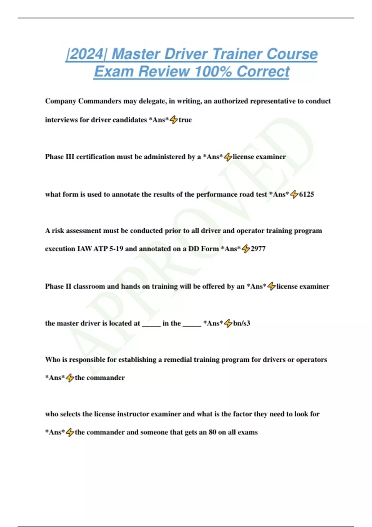 |2024| Master Driver Trainer Course Exam Review 100% Correct Company Commanders may delegate, in writing, an authorized representative to conduct interviews for driver candidates *Ans* true Phase III certification must be administered by a *Ans* license examiner what form is used to annotate the results of the performance road test *Ans* 6125 A risk assessment must be conducted prior to all driver and operator training program execution IAW ATP 5-19 and annotated on a DD Form *Ans* 2977 Phase II classroom and hands on training will be offered by an *Ans* license examiner the master driver is located at _____ in the _____ *Ans* bn/s3 Who is responsible for establishing a remedial training program for drivers or operators *Ans* the commander who selects the license instructor examiner and what is the factor they need to look for *Ans* the commander and someone that gets an 80 on all exams What Chapter of AR 600-55 discusses the Driver or Operator Training Program *Ans* chapter 4 a da form 348 will be reviewed annually for what? *Ans* driver or operator award expiration permits accidents and moving traffic violations remedial required or refresher training reexamination license suspension physical examinations an operators permit is known as *Ans* of 346 or da form 598