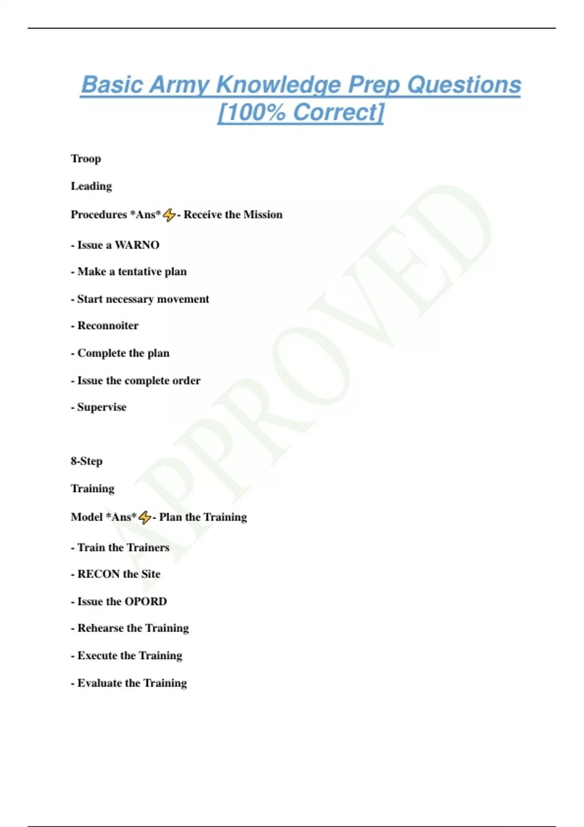 Basic Army Knowledge Prep Questions [100% Correct] Troop Leading Procedures *Ans* - Receive the Mission - Issue a WARNO - Make a tentative plan - Start necessary movement - Reconnoiter - Complete the plan - Issue the complete order - Supervise 8-Step Training Model *Ans* - Plan the Training - Train the Trainers - RECON the Site - Issue the OPORD - Rehearse the Training - Execute the Training - Evaluate the Training - Retrain Priorities of Work *Ans* PRT Prep-Drill *Ans* - Bend & Reach - Rear Lunge - High Jumper - Rower - Squat Bender - Windmill - Forward Lunge - Prone Row - Bent Leg Body Twist - Pushup PRT Recovery Drill *Ans* - Overhead Arm Pul