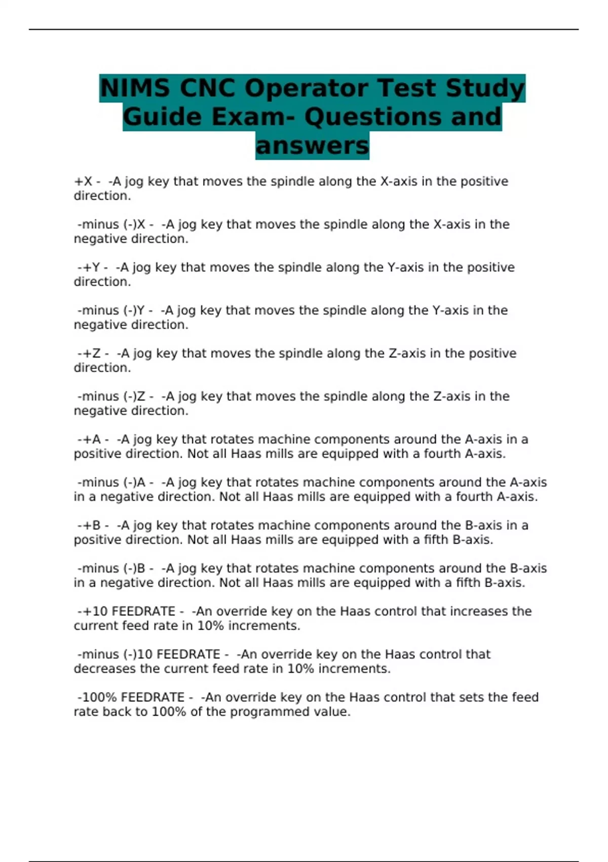 NIMS CNC Operator Test Study Guide Exam- Questions and answers