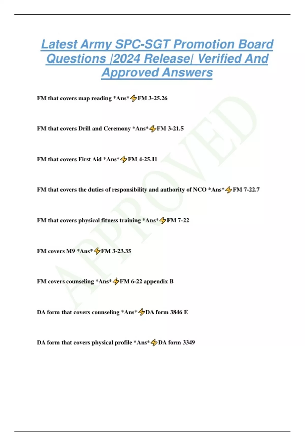 Latest Army SPC-SGT Promotion Board Questions |2024 Release| Verified And Approved Answers FM that covers map reading *Ans* FM 3-25.26 FM that covers Drill and Ceremony *Ans* FM 3-21.5 FM that covers First Aid *Ans* FM 4-25.11 FM that covers the duties of responsibility and authority of NCO *Ans* FM 7-22.7 FM that covers physical fitness training *Ans* FM 7-22 FM covers M9 *Ans* FM 3-23.35 FM covers counseling *Ans* FM 6-22 appendix B DA form that covers counseling *Ans* DA form 3846 E DA form that covers physical profile *Ans* DA form 3349 DA form that covers PRT Scorecard *Ans* DA form 705 ADP form that covers army leadership *Ans* ADP 6-22 Army Regulation that covers military justice *Ans* AR 27-10 Army Regulation that covers wear and appearance of military uniform *Ans* AR 670-1 Army Regulation that covers weight control program *Ans* AR 600-9 Army Regulation that covers salutes, honors and visits of courtesy *Ans* AR 600-25 Army Regulation that covers Army Substance Abuse Program (ASAP) *Ans* AR 600-85 Army Regulation that covers military awards *Ans* AR 600-8-22 Army Regulation that covers enlisted promotion and reduction *Ans* AR 600-8-1