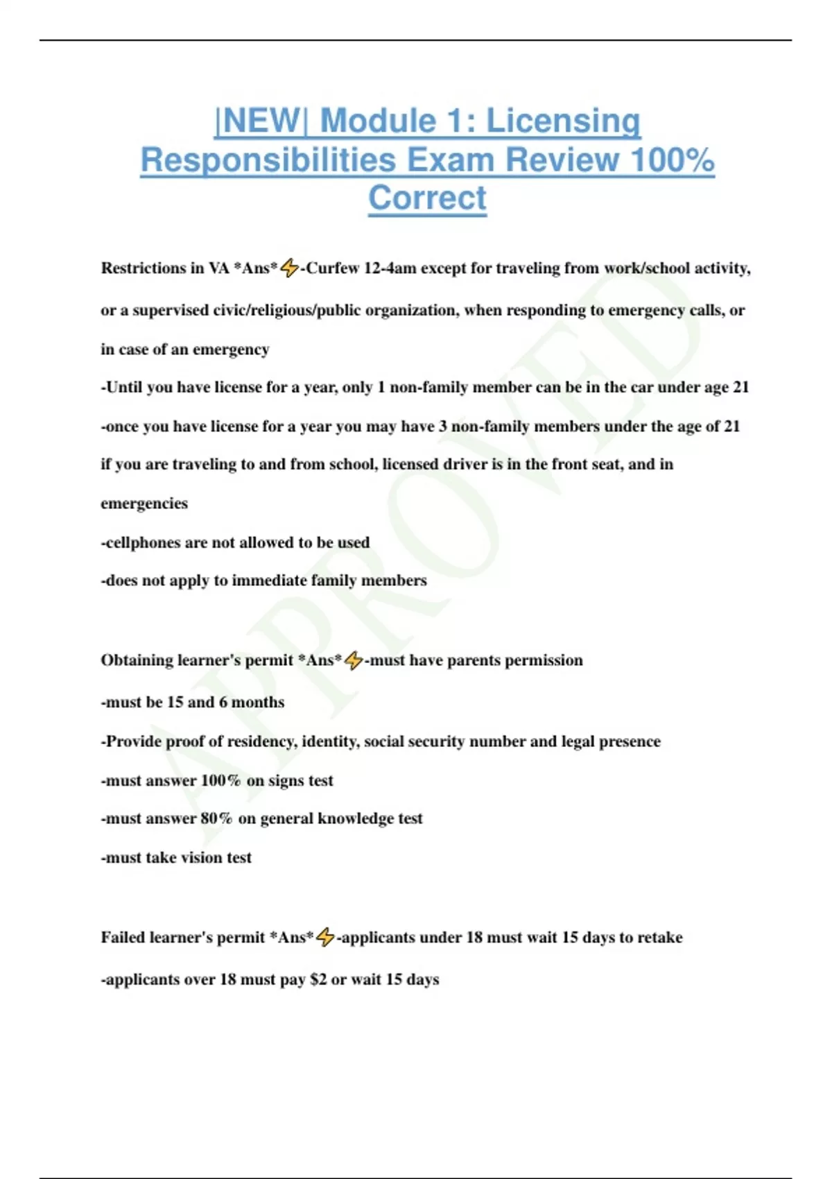 |NEW| Module 1: Licensing Responsibilities Exam Review 100% Correct Restrictions in VA *Ans* -Curfew 12-4am except for traveling from work/school activity, or a supervised civic/religious/public organization, when responding to emergency calls, or in case of an emergency -Until you have license for a year, only 1 non-family member can be in the car under age 21 -once you have license for a year you may have 3 non-family members under the age of 21 if you are traveling to and from school, licensed driver is in the front seat, and in emergencies -cellphones are not allowed to be used -does not apply to immediate family members Obtaining learner's permit *Ans* -must have parents permission -must be 15 and 6 months -Provide proof of residency, identity, social security number and legal presence -must answer 100% on signs test -must answer 80% on general knowledge test -must take vision test Failed learner's permit *Ans* -applicants under 18 must wait 15 days to retake -applicants over 18 must pay $2 or wait 15 days -fail 3 times must take driver's ed. -fail more than 3 times you must take the 8 Hour Learner's Permit Test Prep Course Permit Guidelines *Ans* -should practice with a licensed driver who is at least 21 or a family member at least 18 - carriers may not carry more than 3 passengers who are under the age of 18. Obtaining Driver's license *Ans* -must be at least 16 years and 3 months old -must hold a learner's permit for at least 9 months -must successfully complete driver's ed - parent permission as well as a certified 45 hours (at least 15 of which were after sunset) is a must for applicants under the age of 18. - must attend Partners for Safe Teen Driving Program with you parent/guardian -When you start driving, you must carry with you, your 180 day temporary license (TDL180) - Organ Donor *Ans* -choice will be shown on license and permit with a heart -anyone can be a donor -it does not cost anything -you can be a donor in any state