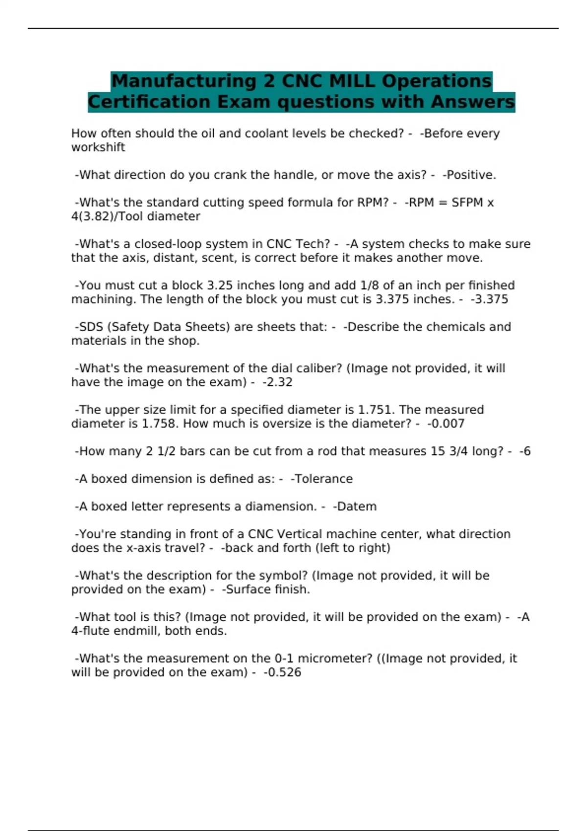 Manufacturing 2 CNC MILL Operations Certification Exam questions with Answers