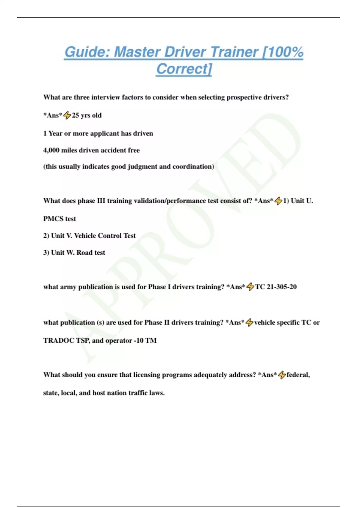Guide: Master Driver Trainer [100% Correct] What are three interview factors to consider when selecting prospective drivers? *Ans* 25 yrs old 1 Year or more applicant has driven 4,000 miles driven accident free (this usually indicates good judgment and coordination) What does phase III training validation/performance test consist of? *Ans* 1) Unit U. PMCS test 2) Unit V. Vehicle Control Test 3) Unit W. Road test what army publication is used for Phase I drivers training? *Ans* TC 21-305-20 what publication (s) are used for Phase II drivers training? *Ans* vehicle specific TC or TRADOC TSP, and operator -10 TM What should you ensure that licensing programs adequately address? *Ans* federal, state, local, and host nation traffic laws. the implementation of AR 600-55 and any additional requirements are made necessary by what factors? *Ans* local traffic conditions, civil restrictions, accident data, and desired standards of operator performance and preventive maintenance. who develops SOP's for SUBORDINATE organizations to ensure they are provided clear guidance on training, certifying and licensing operators on vehicles and equipment? *Ans* Brigade commanders what is the senior occupant in all army vehicles responsible for? *Ans* -Ensure the driver does not exceed maximum operating hours listed in AR 385-10 -Ensure the authorized seating capacity of the vehicle is not exceeded -ensure all occupants wear restrain systems -assist driver in recognizing unsafe traffic conditions -ensure the driver complies with road signs ensure the operator is properly licensed on equipment be responsible for the overall safety what are the phases of drivers training? *Ans* Phase I: initial operator training (classroom) Phase II: equipment training in the classroom and hands on Phase III: Validation/Road tes