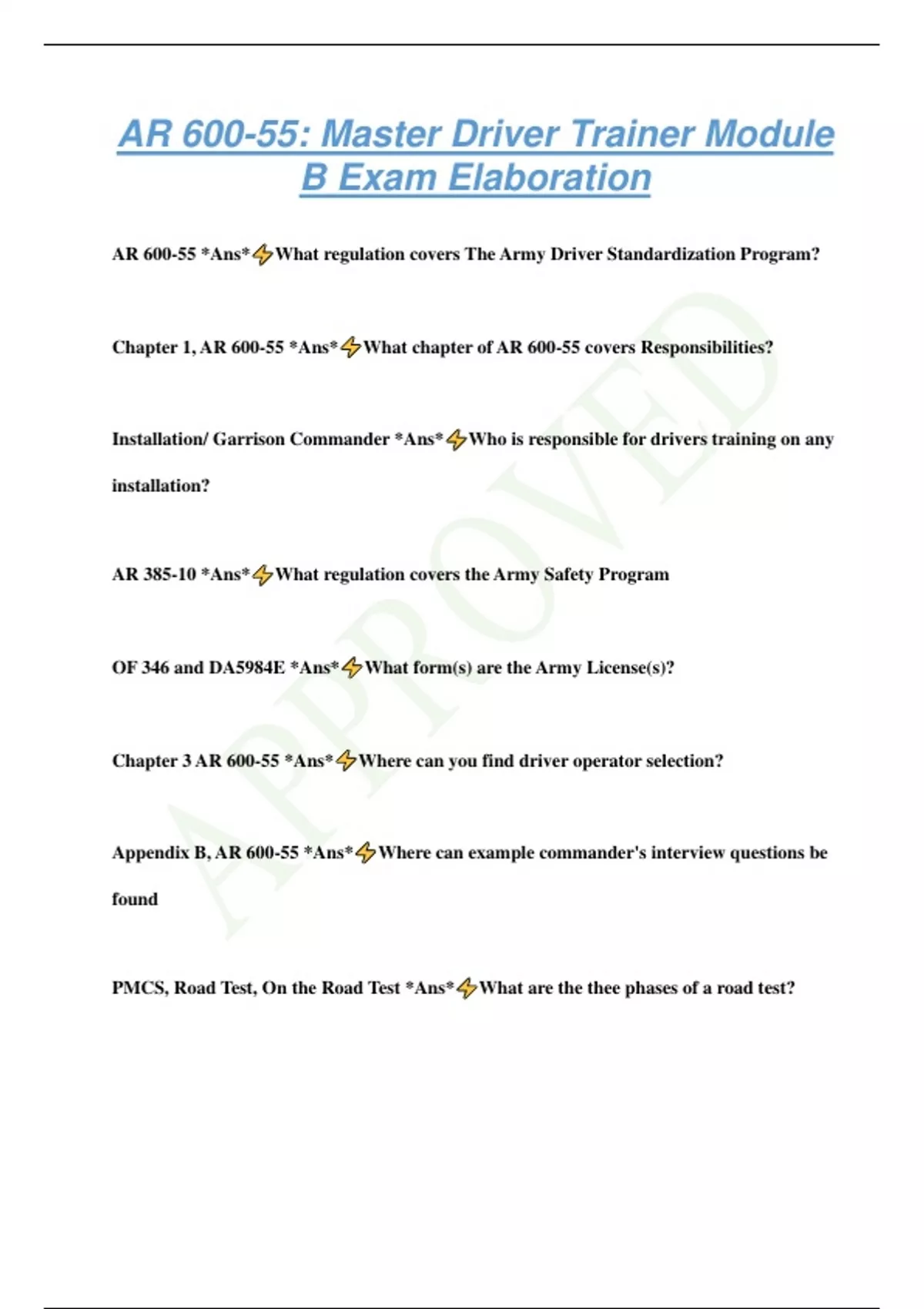AR 600-55: Master Driver Trainer Module B Exam Elaboration AR 600-55 *Ans* What regulation covers The Army Driver Standardization Program? Chapter 1, AR 600-55 *Ans* What chapter of AR 600-55 covers Responsibilities? Installation/ Garrison Commander *Ans* Who is responsible for drivers training on any installation? AR 385-10 *Ans* What regulation covers the Army Safety Program OF 346 and DA5984E *Ans* What form(s) are the Army License(s)? Chapter 3 AR 600-55 *Ans* Where can you find driver operator selection? Appendix B, AR 600-55 *Ans* Where can example commander's interview questions be found PMCS, Road Test, On the Road Test *Ans* What are the thee phases of a road test? Learners Permit *Ans* What type of permit must a soldier have to conduct PMCS during drivers training? Appendix C, AR 600-55 *Ans* Where can you find Commercial Drivers License classifications? Class A CDL *Ans* Which class of CDL: A combination vehicle where 26,001 GVWR or more or the vehicle being towed exceeds 10,000 LBS? Class B CDL *Ans* Which Class of CDL; A single vehicle where 26,001 GVWR or more or the vehicle being towed is not more than 10,000