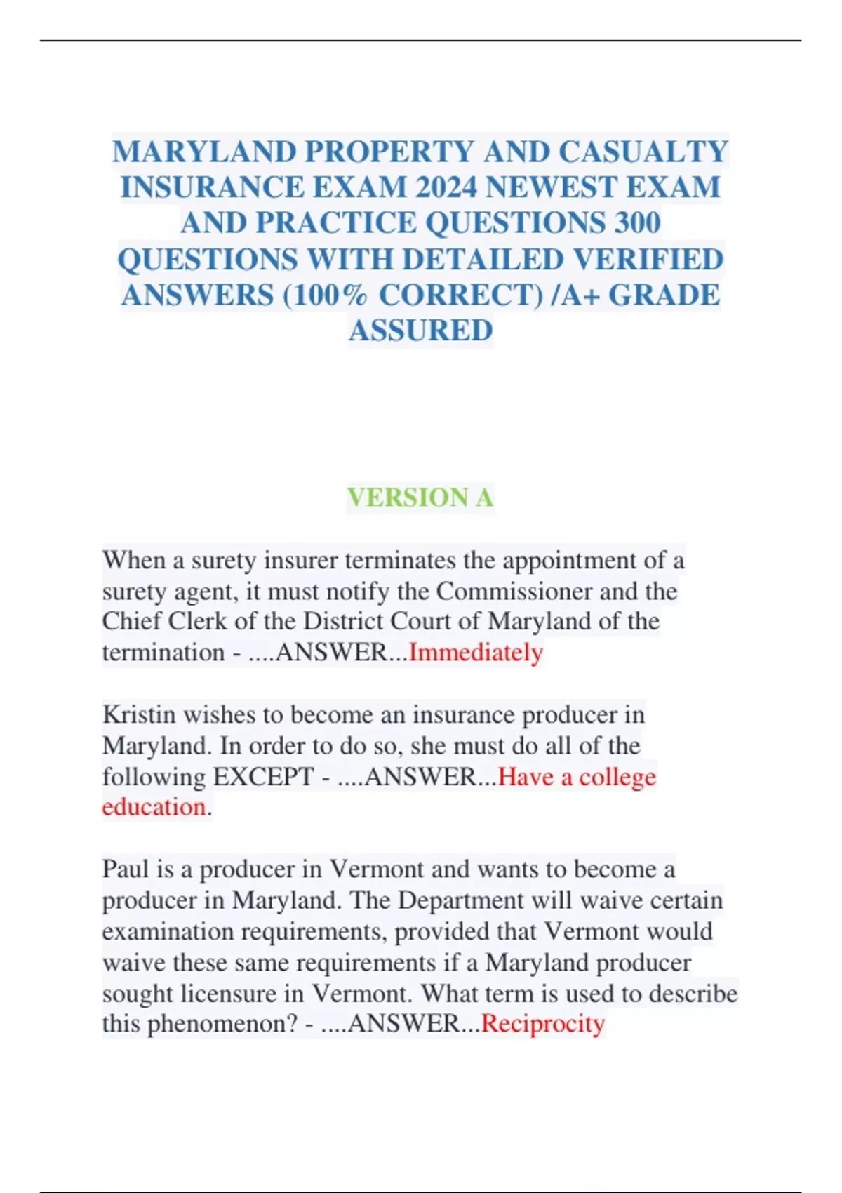 MARYLAND PROPERTY AND CASUALTY INSURANCE EXAM 2024 NEWEST EXAM AND PRACTICE QUESTIONS 300 QUESTIONS WITH DETAILED VERIFIED ANSWERS (100% CORRECT) /A+ GRADE ASSURED
