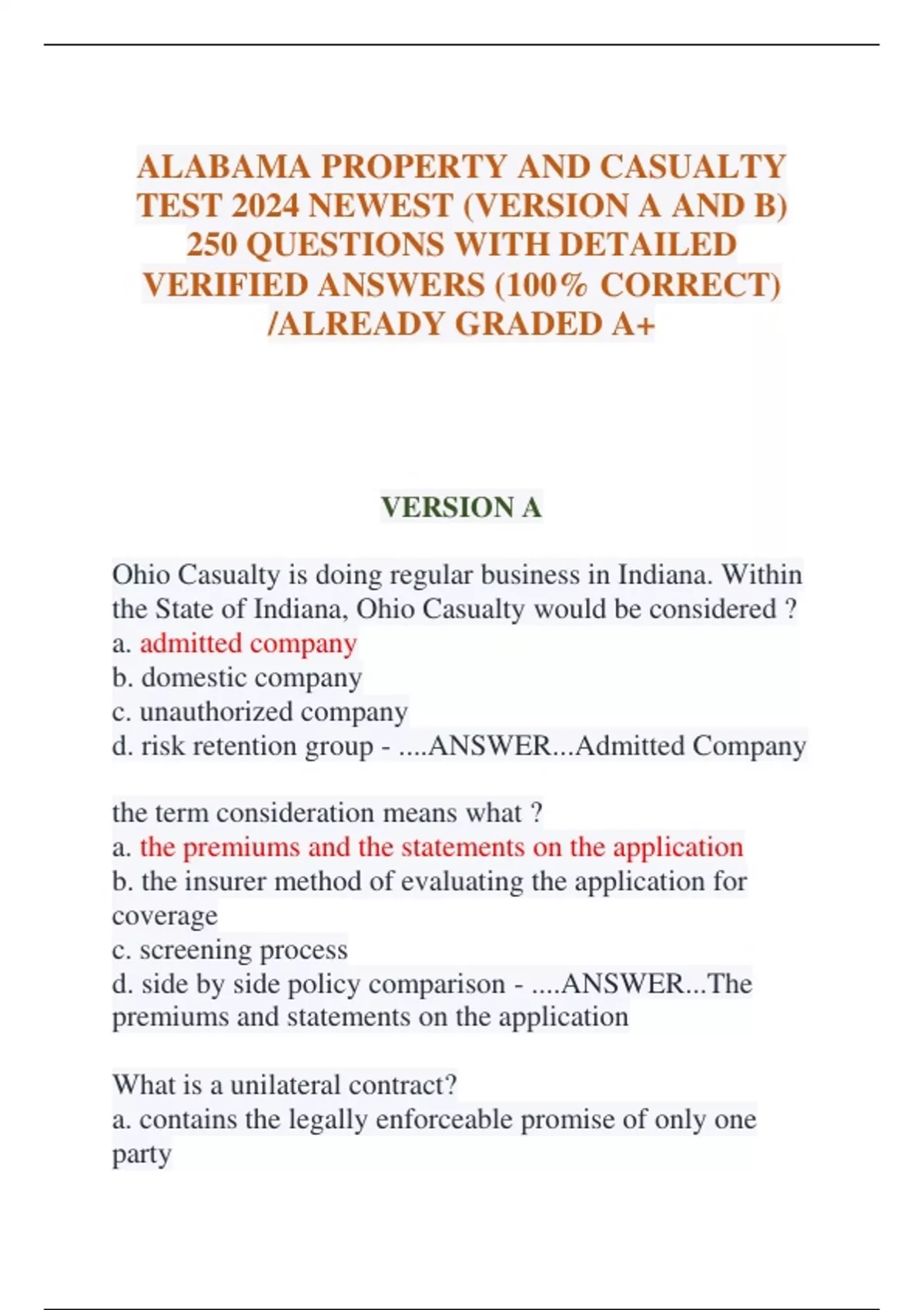 ALABAMA PROPERTY AND CASUALTY TEST 2024 NEWEST (VERSION A AND B) 250 QUESTIONS WITH DETAILED VERIFIED ANSWERS (100% CORRECT) /ALREADY GRADED A+