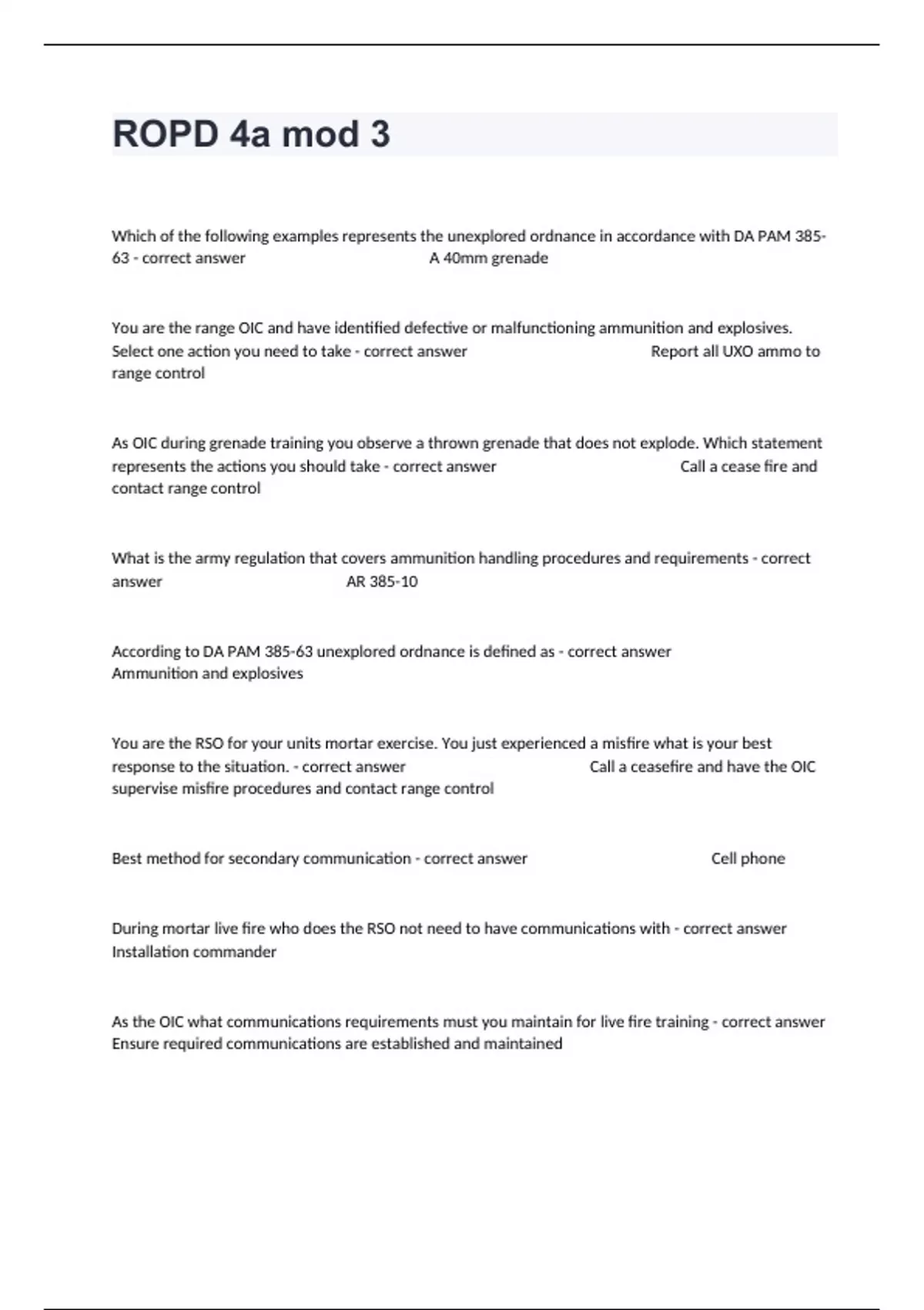 Which of the following examples represents the unexplored ordnance in accordance with DA PAM 385-63 - correct answer A 40mm grenade You are the range OIC and have identified defective or malfunctioning ammunition and explosives. Select one action you need to take - correct answer Report all UXO ammo to range control As OIC during grenade training you observe a thrown grenade that does not explode. Which statement represents the actions you should take - correct answer Call a cease fire and contact range control What is the army regulation that covers ammunition handling procedures and requirements - correct answer AR 385-10 According to DA PAM 385-63 unexplored ordnance is defined as - correct answer Ammunition and explosives You are the RSO for your units mortar exercise. You just experienced a misfire what is your best response to the situation. - correct answer Call a ceasefire and have the OIC supervise misfire procedures and contact range control Best method for secondary communication - correct answer Cell phone During mortar live fire who does the RSO not need to have communications with - correct answer Installation commander As the OIC what communications requirements must you maintain for live fire training - correct answer Ensure required communications are established and maintained What are the three steps in initiating a response to a medical emergency - correct answer Call a cease fire While conducting a live fire event, one of your soldiers is hit by shrapnel. What is the first step in the emergency procedure - correct answer Call cease fire and start first aid Responsibility of OIC and RSO - correct answer All of the above Army regulation that provides safety policy, standards, responsibilities for maintaining - correct answer AR 385-10 Da Pam 385-64 provides guidance on what - correct answer Ammunition handling policies and procedures According to AR 385-10 what is the definition for nonstandard explosives or ammunition - correct answer Any explosives or ammunition that have not been accepted and type classified for use by the us military Sgt Thomas wants to mix blanks with live rounds to simulate malfunctions, what do you say - correct answer We can't do that Where do you place a live fire range flag - correct answer At the road gate What is not a commonly used range warning symbol - correct answer Caution tape What is the purpose for warning signs and signals for range safety - correct answer Warn personnel of the risk of entering a range You are OIC and light strikes close to your range, what do you do? - correct answer Order cease fire, get personnel to safety, and contact range control